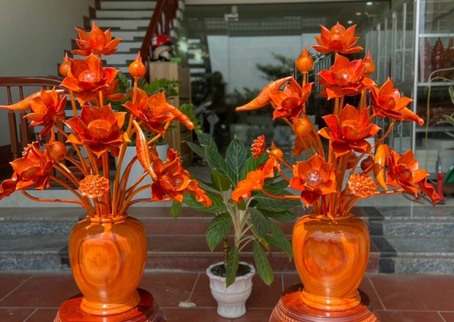 Bình hoa sen trang trí phòng khách ,phòng thờ được làm bằng chất liệu gỗ hương đỏ tự nhiên 100%  Kt bình cắm 30×25cm ,kt cao tổng kể cả  hoa lá gương 92cm ,xòe rộng 70cm  _ Bình hoa sen được tiện phân khúc từ đầu miệng ,xuống chân đế với độ mền mại với độ chính xác cao .Kết hợp với khắc tỉa hoa lá cành ,tỉ mỉ tinh sảo kỳ công .Đi hầu hết tất mọi tri tiết của bình hoa sen ,Được gọt tỉa chỉnh sửa ,kênh bong sắc nét hoàn toàn bằng tay thủ công .Đồng thời bình hoa sen được kiểm định kỹ lưỡng khắt khe ,như cho vào thẩm sấy cho gỗ khô kiệt .Mục đích trống dập nứt vênh mo mối mọt .Kết hợp với trà nhám ,đánh giấy giáp nhiều nước sờ mát lạnh song cho vào phun lót làm bóng mờ ,để giữ lại mầu sắc vân gỗ tự nhiên .Bình hoa sen được làm và hoàn thiện do bàn tay khối óc tài hoa .Từ những người thợ dầy rặn kinh nghiệm ,Cũng như tay nghề cao trong làng nghề truyền thống .Chính vì thế bình hoa sen bằng gỗ hương đỏ đã đáp ứng đầy đủ mọi tiêu trí cần thiết như ( Đẹp bền rẻ ) Thẩm mỹ nghệ thuật với chất lượng tuyệt vời