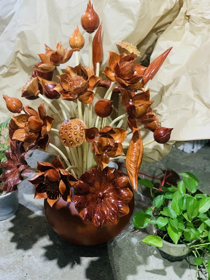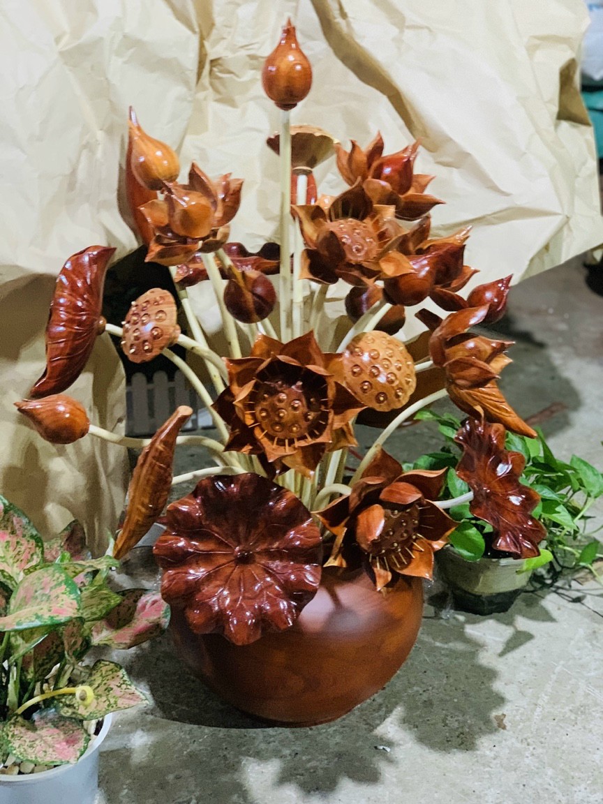 Bình hoa sen 25 cành ,trang trí phòng khách ,phòng thờ chum cắm gỗ hương đỏ ,hoa lá gương bằng gỗ ngọc am thơm phức  đẹp long lanh    1 bình hoa sen 25 cành ,hoa lá ,gương , trang trí phòng khách ,phòng thờ bằng gỗ hương đỏ đẹp long lanh