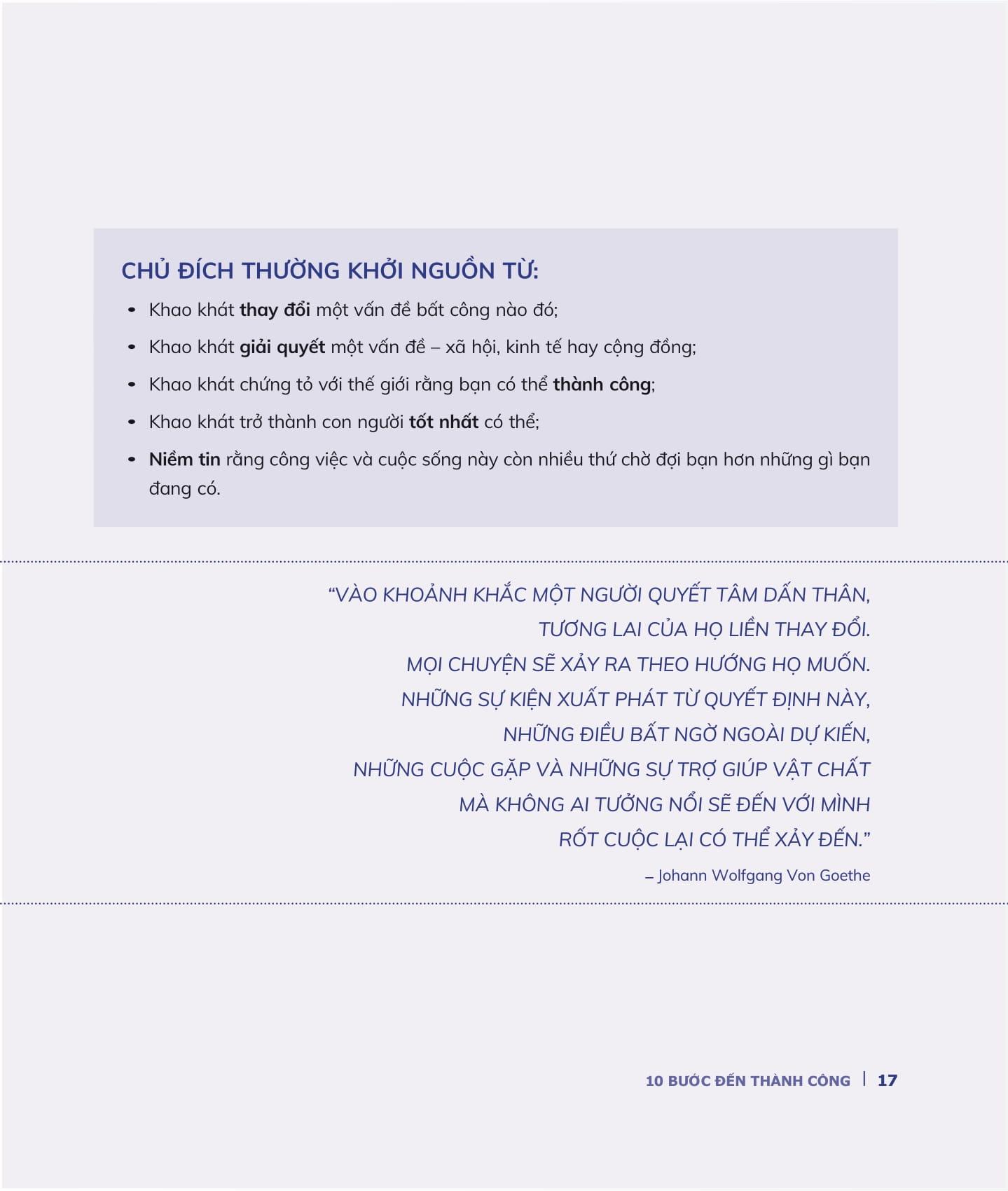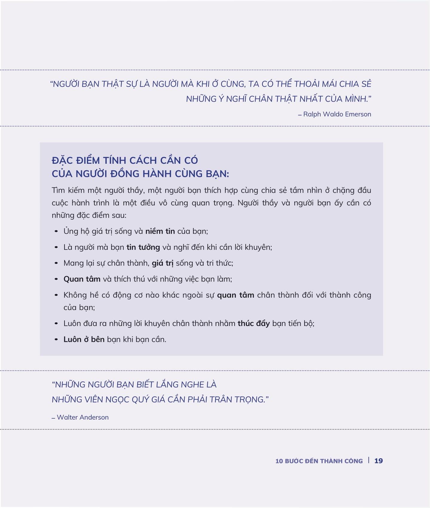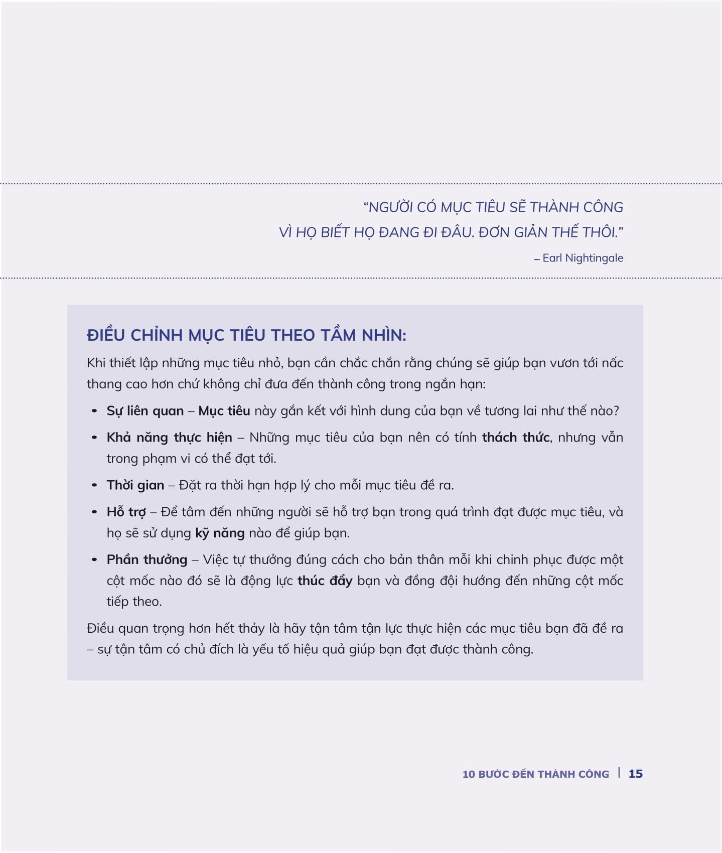 Thành công tùy thuộc vào tư duy và cách nhìn nhận của bạn – thứ sẽ kiểm soát cách bạn ứng xử và tương tác với những người xung quanh. Cuốn sách “10 bước đến thành công” sẽ giúp bạn phát triển lối tư duy chiến thắng và hướng dẫn bạn vận dụng nó trong suốt hành trình chạm đến vinh quang. Nếu không có nhận thức và góc nhìn đúng đắn, hành trình của bạn sẽ đầy gian nan, và bất cứ rào cản nào cũng có thể trở thành chướng ngại khó vượt qua. Chuẩn bị tinh thần sẵn sàng đón nhận mọi khó khăn sẽ giúp bạn dễ dàng vượt qua thử thách hơn nhiều trên con đường mình chọn.