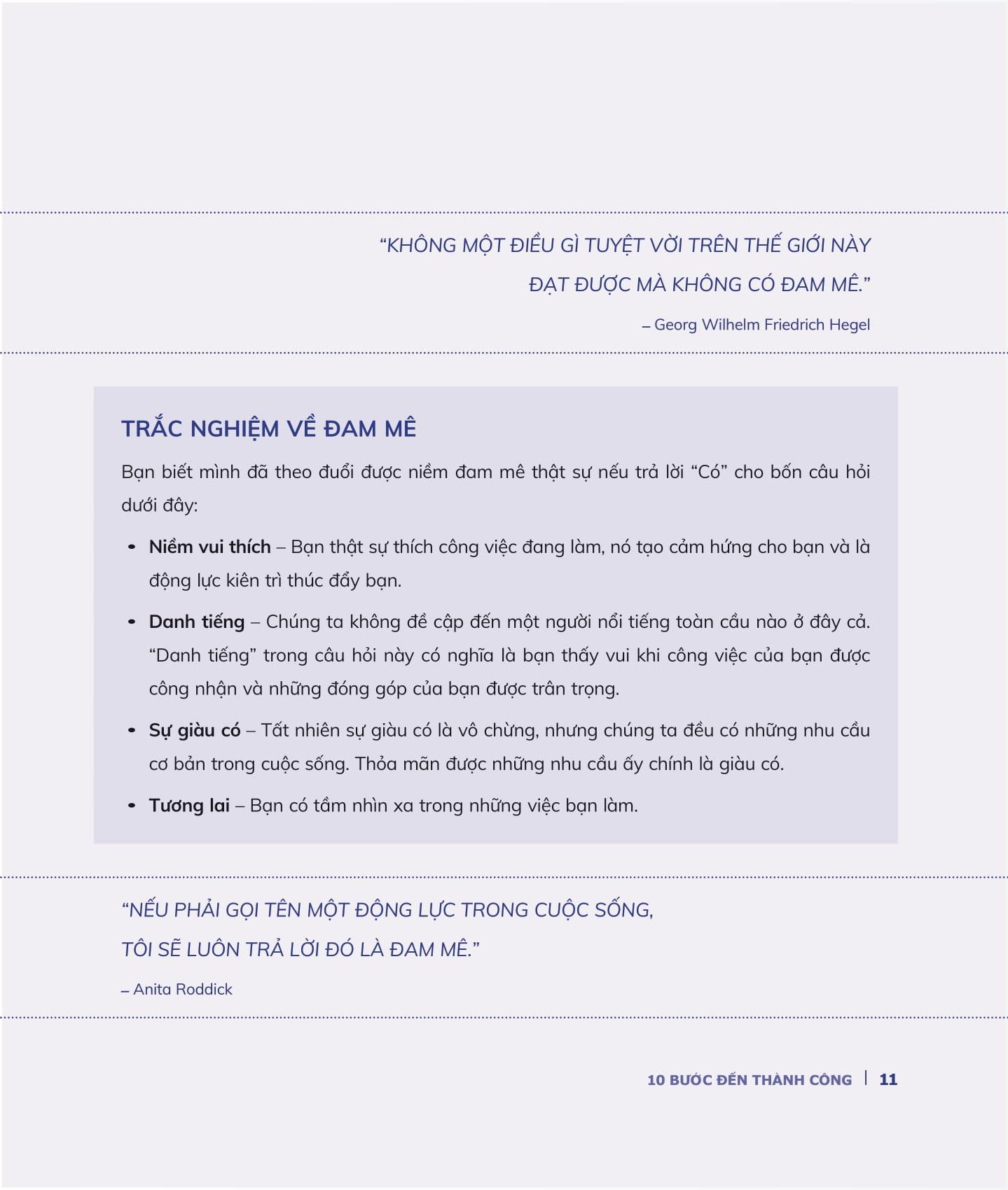 Những tố chất ấy, tác giả John Leach gọi là “10 bước đến thành công”, và sẽ giới thiệu cặn kẽ đến bạn qua cuốn sách cùng tên này. Hãy hiểu cho rõ rằng việc này không hề dễ dàng, và chắc chắn không thể giúp bạn giải quyết các vấn đề trong cuộc sống một cách nhanh chóng. Con đường dẫn tới thành công không có lối tắt. Đó là lý do vì sao thành công thường được ví như một phần thưởng.