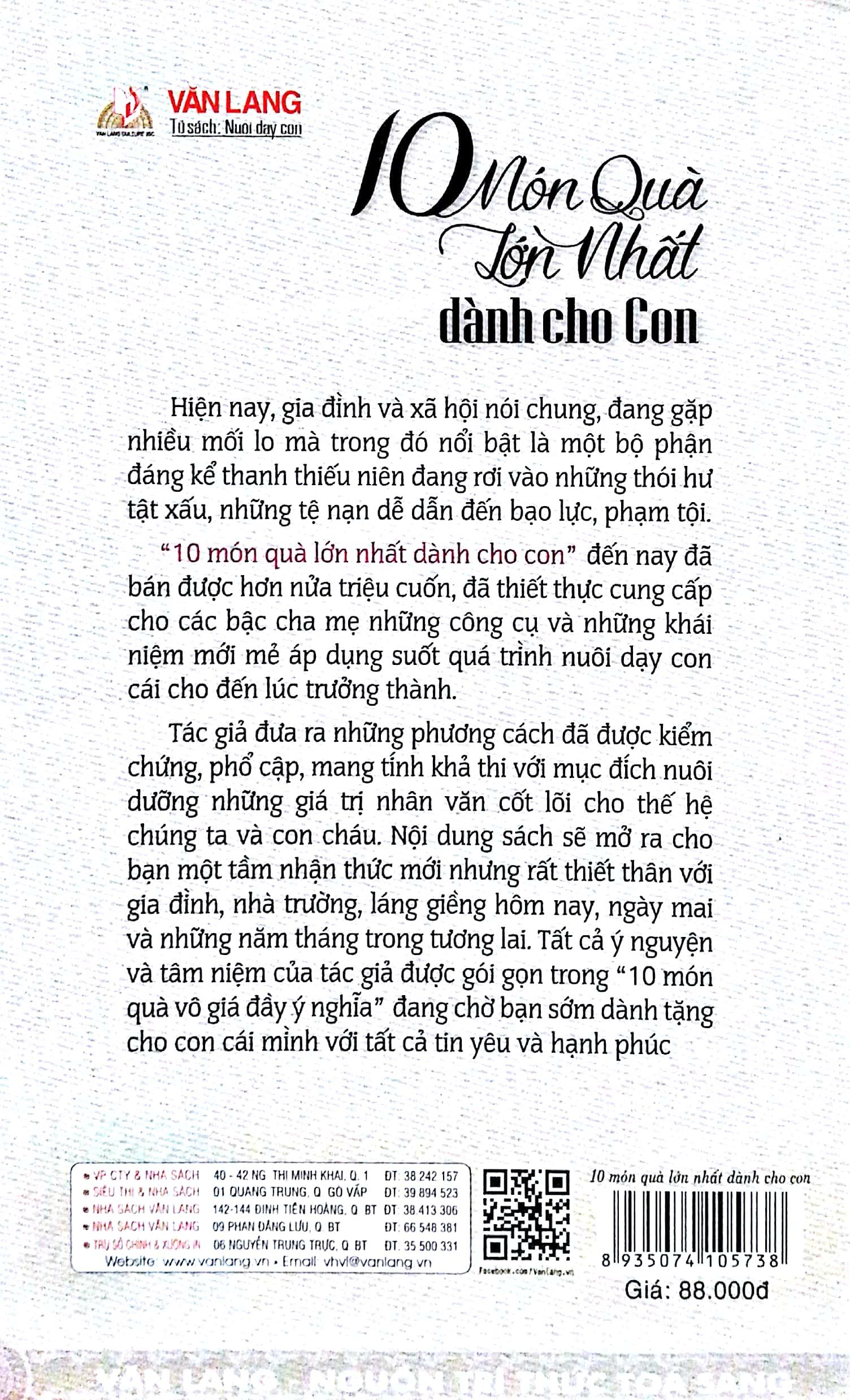 Sách 10 món quà lớn nhất dành cho con đến nay đã bán được hơn nửa triệu cuốn, đã thiết thực cung cấp cho các bậc cha mẹ những công cụ và những khái niệm mới mẻ áp dụng suốt quá trình nuôi dạy con cái cho đến lúc trưởng thành.