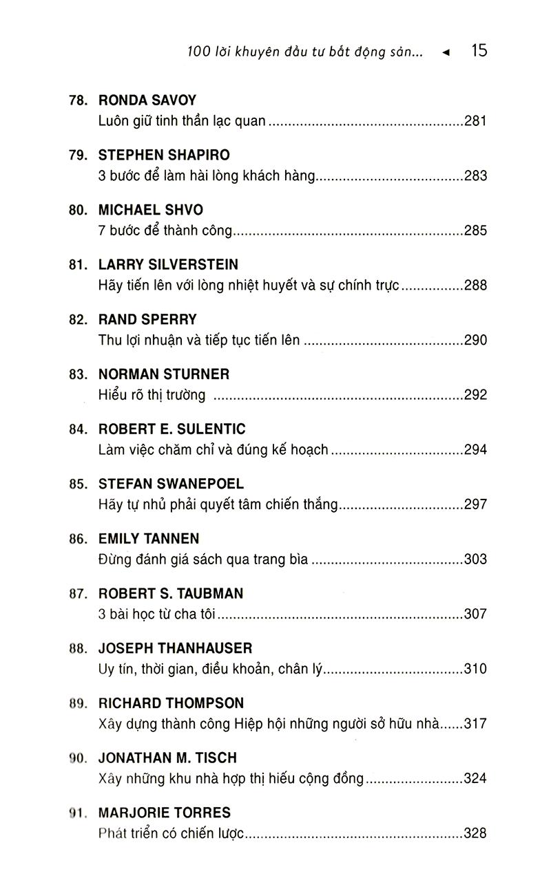 Trong cuốn sách này, bạn sẽ thấy sự sáng suốt khác thường có được là nhờ vào những kinh nghiệm và bài học mà những nhân vật có thế lực trong kinh doanh bất động sản trên khắp nước Mỹ phải trải bao khó khăn mới rút ra được. Có rất nhiều điều mà lẽ ra tất cả chúng ta đã có thể làm tốt hơn: từ việc bỏ lỡ cơ hội, dự đoán sai về thị trường đến việc thương lượng quá cao hoặc quá thấp. Những nhà kinh doanh này - cả nam lẫn nữ - sẽ kể cho bạn biết họ đã học được gì.