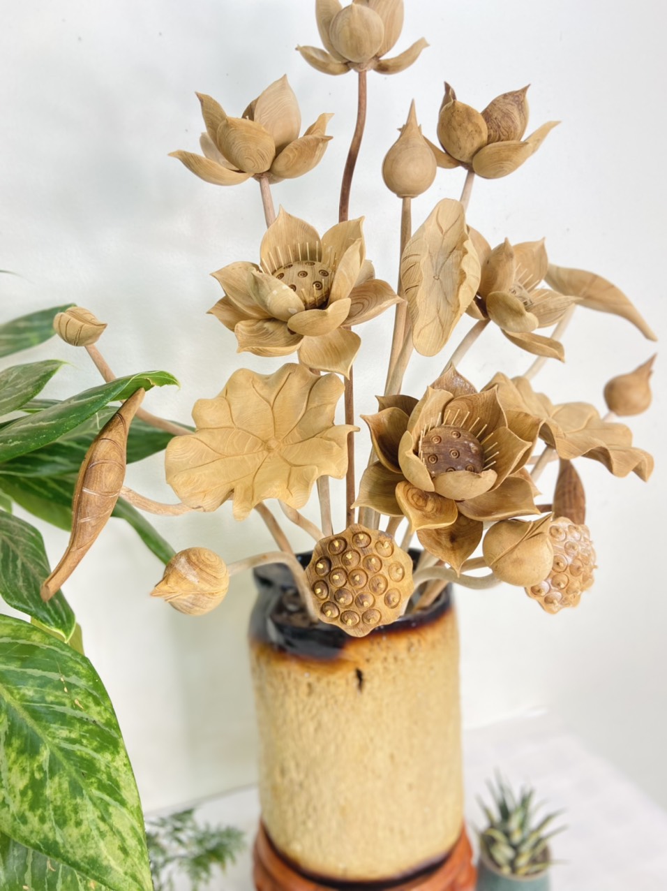 _ 1 bình hoa sen 21 cành trang trí phòng khách ,phòng thờ được làm bằng chất liệu gỗ ngọc am thơm nức tự nhiên 100%  _ Kt bình cắm hoa 20×23,5cm + hoa lá