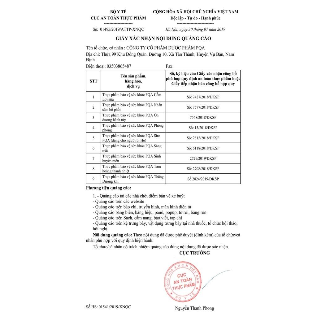 - Địa chỉ sản xuất: Công ty Cổ phần Dược phẩm PQA. Thửa 99, Khu Đồng Quàn, Xã Tân Thành, Huyện Vụ Bản, Tỉnh Nam Định. Thành phần Cho 1 gói 5g:
