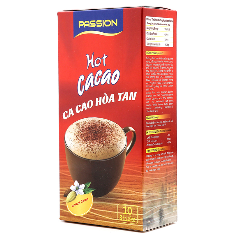 – Hướng dẫn sử dụng: Đổ một gói ca cao hiệu Passion Hot Cacao vào ly. Thêm 50 ml nước
