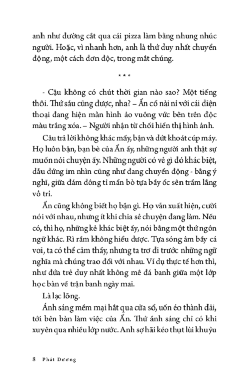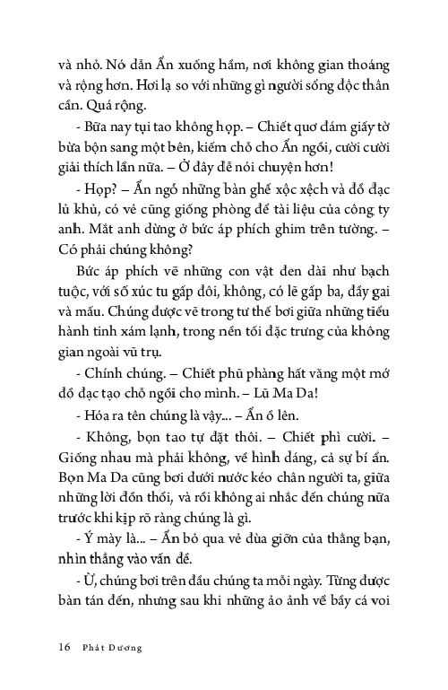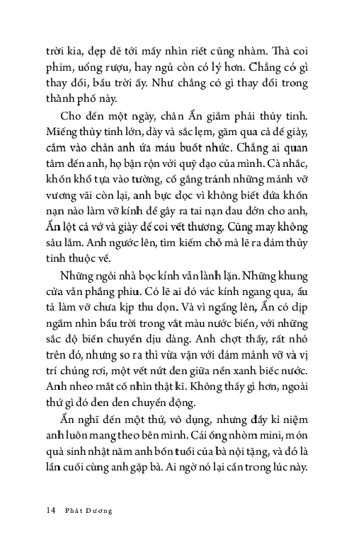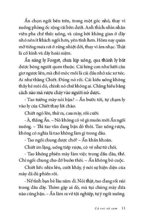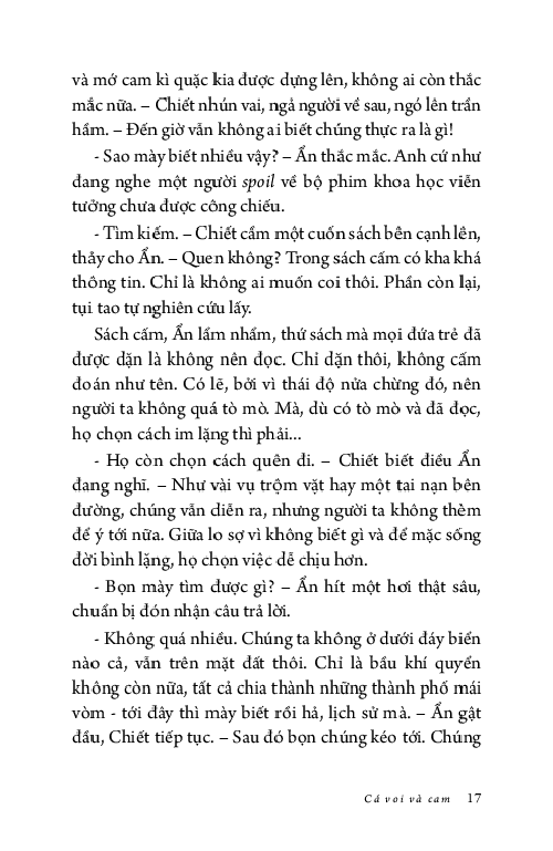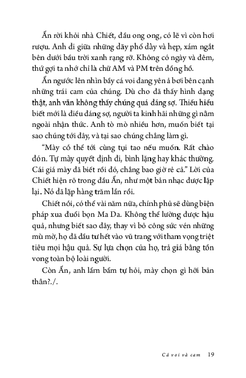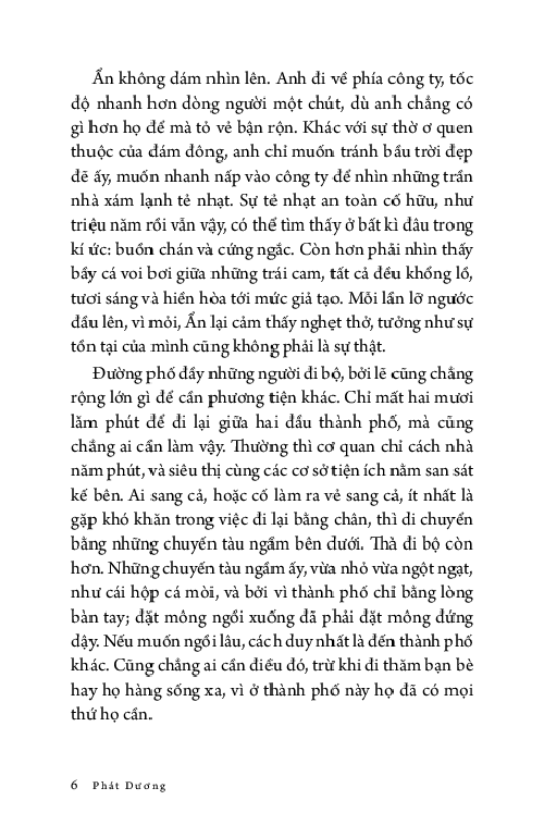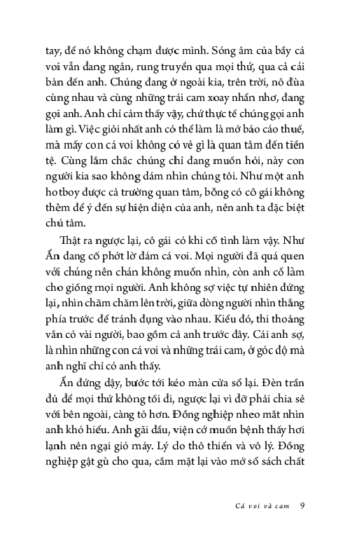 Ẩn không dám nhìn lên, anh chỉ muốn tránh bầu trời đẹp đẽ ấy, muốn nhanh nấp vào công ty để nhìn những trần nhà xám lạnh tẻ nhạt. Sự tẻ nhạt an toàn cố hữu, như triệu năm rồi vẫn vậy, có thể tìm thấy ở bất kì đâu trong kí ức: buồn chán và cứng ngắc. Còn hơn phải nhìn thấy bầy cá voi bơi giữa những trái cam, tất cả đều khổng lồ, tươi sáng và hiền hòa tới mức giả tạo.”