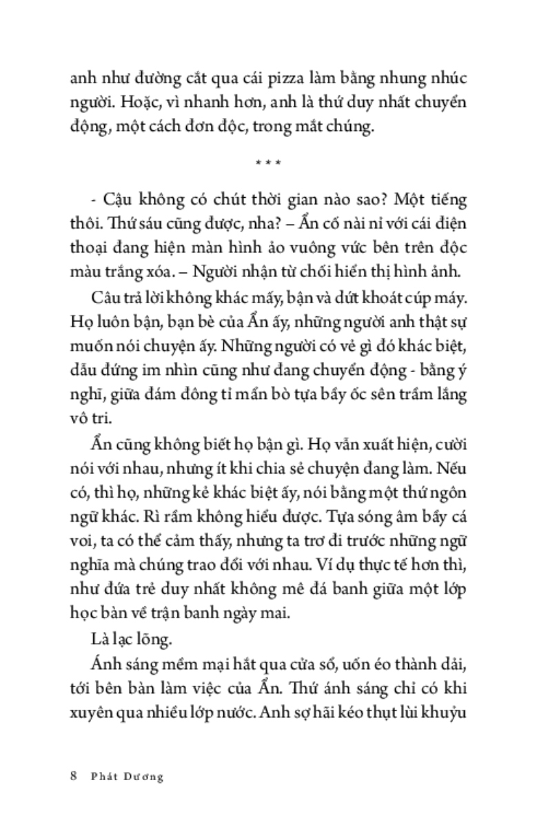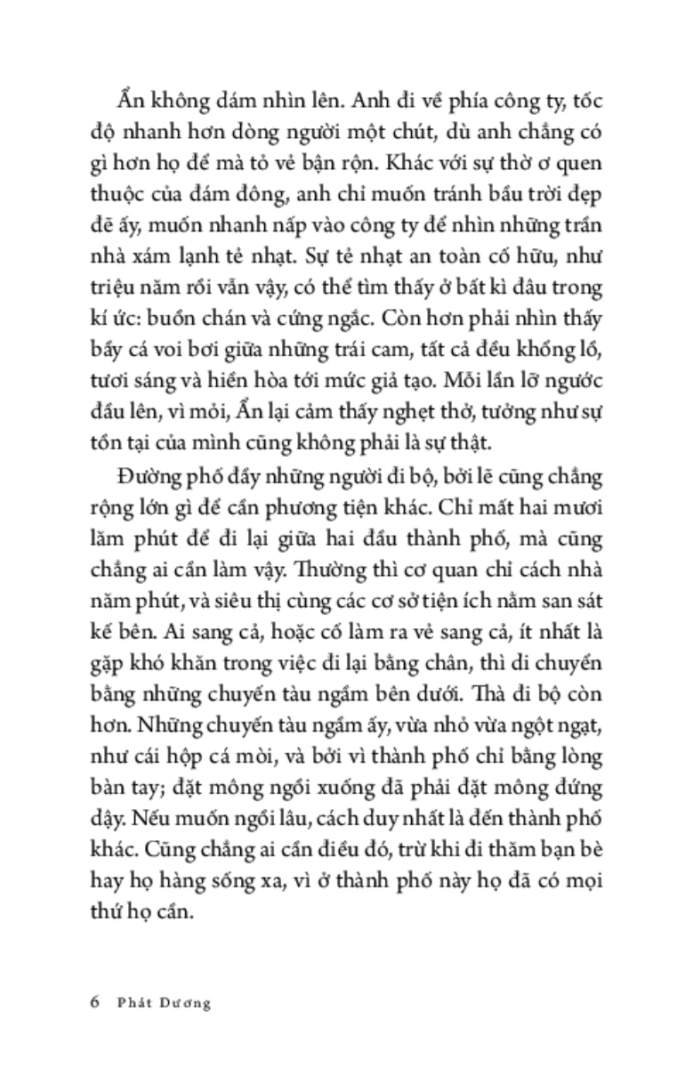 Ẩn không dám nhìn lên, anh chỉ muốn tránh bầu trời đẹp đẽ ấy, muốn nhanh nấp vào công ty để nhìn những trần nhà xám lạnh tẻ nhạt. Sự tẻ nhạt an toàn cố hữu, như triệu năm rồi vẫn vậy, có thể tìm thấy ở bất kì đâu trong kí ức: buồn chán và cứng ngắc. Còn hơn phải nhìn thấy bầy cá voi bơi giữa những trái cam, tất cả đều khổng lồ, tươi sáng và hiền hòa tới mức giả tạo.”