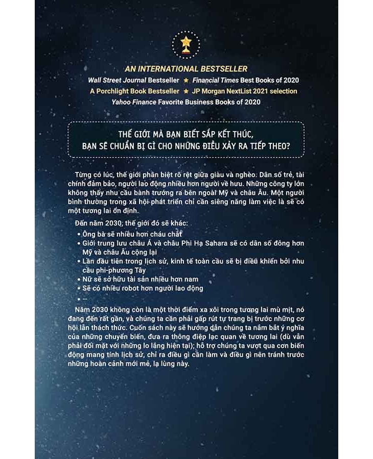 Năm 2030, không còn là một thời điểm xa xôi trong tương lai mù mịt, nó đang đến rất gần, và chúng ta cần phải gấp rút tự trang bị trước những cơ hội lẫn thách thức. Cuốn sách này sẽ hướng dẫn chúng ta nắm bắt ý nghĩa của những chuyển biến, đưa ra thông điệp lạc quan về tương lai (dù vẫn phải đối mặt với những lo lắng hiện tại); hỗ trợ chúng ta vượt qua cơn biến động mang tính lịch sử, chỉ ra điều gì cần làm và điều gì nên tránh trước những hoàn cảnh mới mẻ, lạ lùng này. ừng có lúc, thế giới phân biệt rõ rệt giữa giàu và nghèo. Dân số trẻ, tài chính đảm bảo, người lao động nhiều hơn người về hưu. Những công ty lớn không thấy nhu cầu bành trướng ra bên ngoài Mỹ và châu Âu. Một người bình thường trong xã hội phát triển chỉ cần siêng năng làm việc là sẽ có một tương lai ổn định.