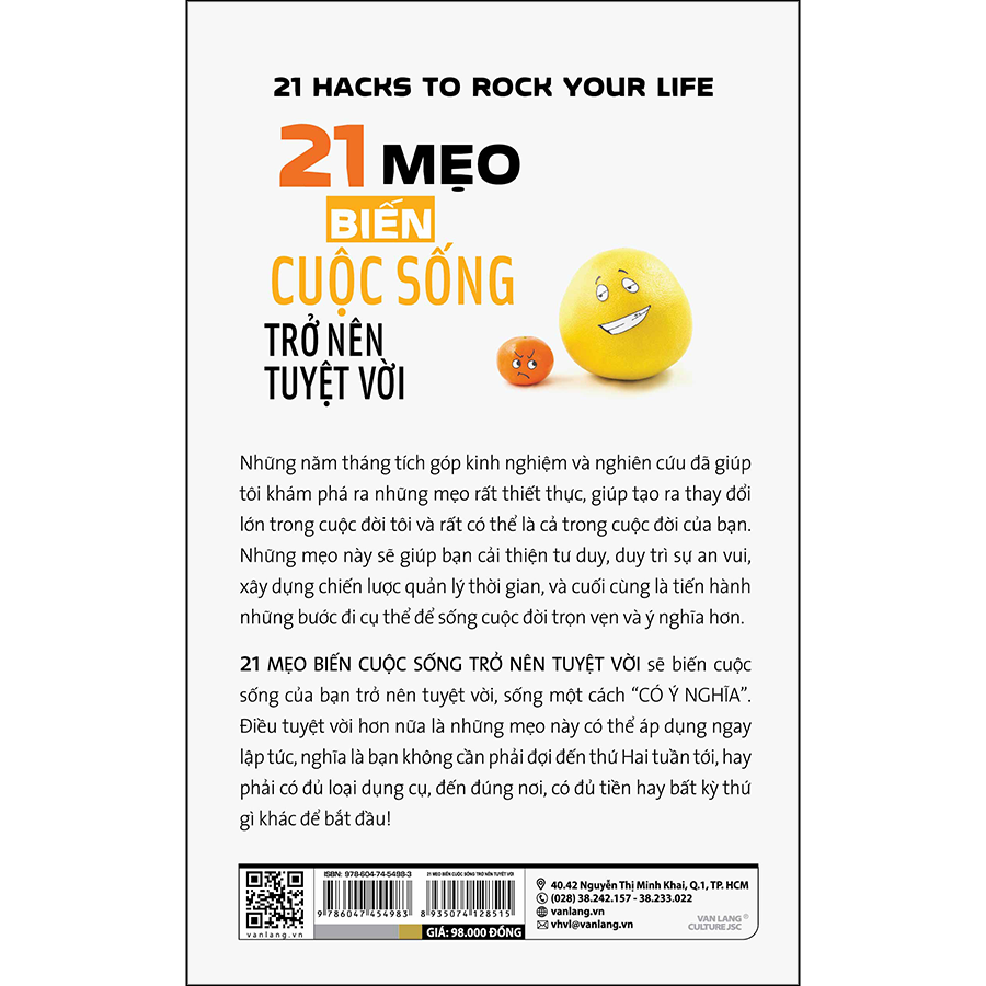 Những năm tháng tích góp kinh nghiệm và nghiên cứu đã giúp tôi khám phá ra những mẹo rất thiết thực, giúp tạo ra thay đổi lớn trong cuộc đời tôi và rất có thể là cả trong cuộc đời của bạn. Những mẹo này sẽ giúp bạn cải thiện tư duy, duy trì sự an vui, xây dựng chiến lược quản lý thời gian, và cuối cùng là tiến hành những bước đi cụ thể để sống cuộc đời trọn vẹn và ý nghĩa hơn. 21 MẸO BIẾN CUỘC SỐNG TRỞ NÊN TUYỆT VỜI sẽ biến cuộc sống của bạn trở nên tuyệt vời, sống một cách “CÓ Ý NGHĨA”. Điều tuyệt vời hơn nữa là những mẹo này có thể áp dụng ngay lập tức, nghĩa là bạn không cần phải đợi đến thứ Hai tuần tới, hay phải có đủ loại dụng cụ, đến đúng nơi, có đủ tiền hay bất kỳ thứ gì khác để bắt đầu!