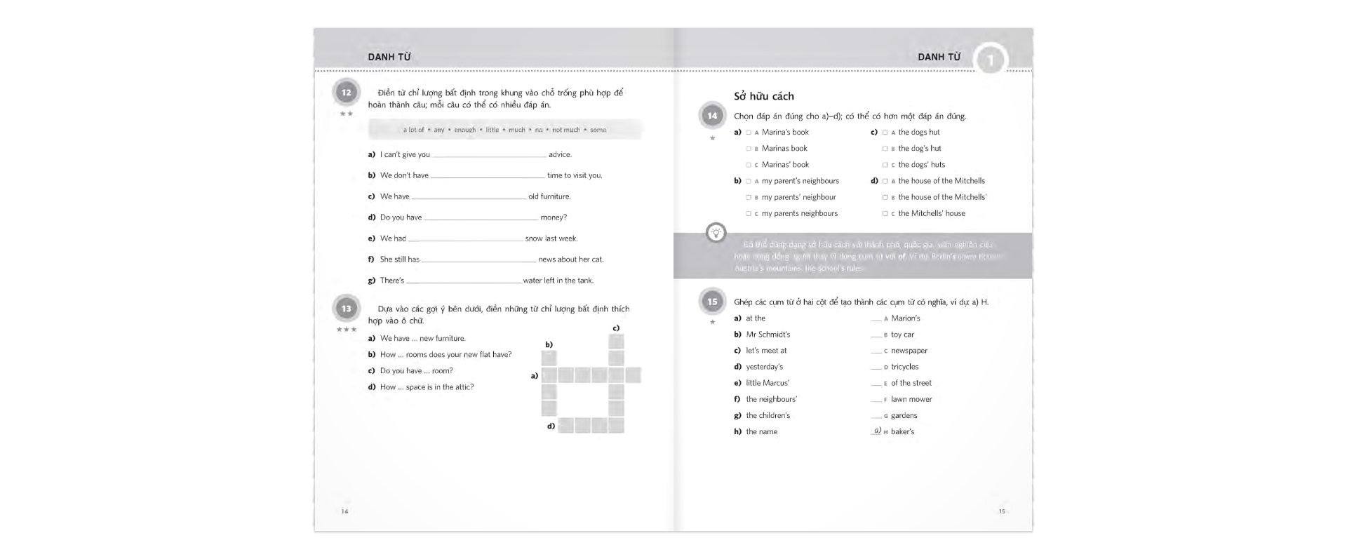 Mua tại TiktokQuyển sách này mang đến một kế hoạch luyện tập hiệu quả giúp bạn nhanh chóng nắm vững kiến thức ngữ pháp tiếng Anh. Hãy học theo trình tự tất cả các chủ điểm ngữ pháp trong sách. Lựa chọn những bài tập được đánh dấu * phù hợp với trình độ của bạn (từ A1 – trình độ sơ cấp – đến B2 – trình độ trung cấp) để luyện tập. Chú ý các mẹo và lời khuyên hữu ích để nắm vững và mở rộng kiến thức. Bảng từ Anh-Việt ở cuối sách hỗ trợ bạn tra từ mới trong lúc làm bài.