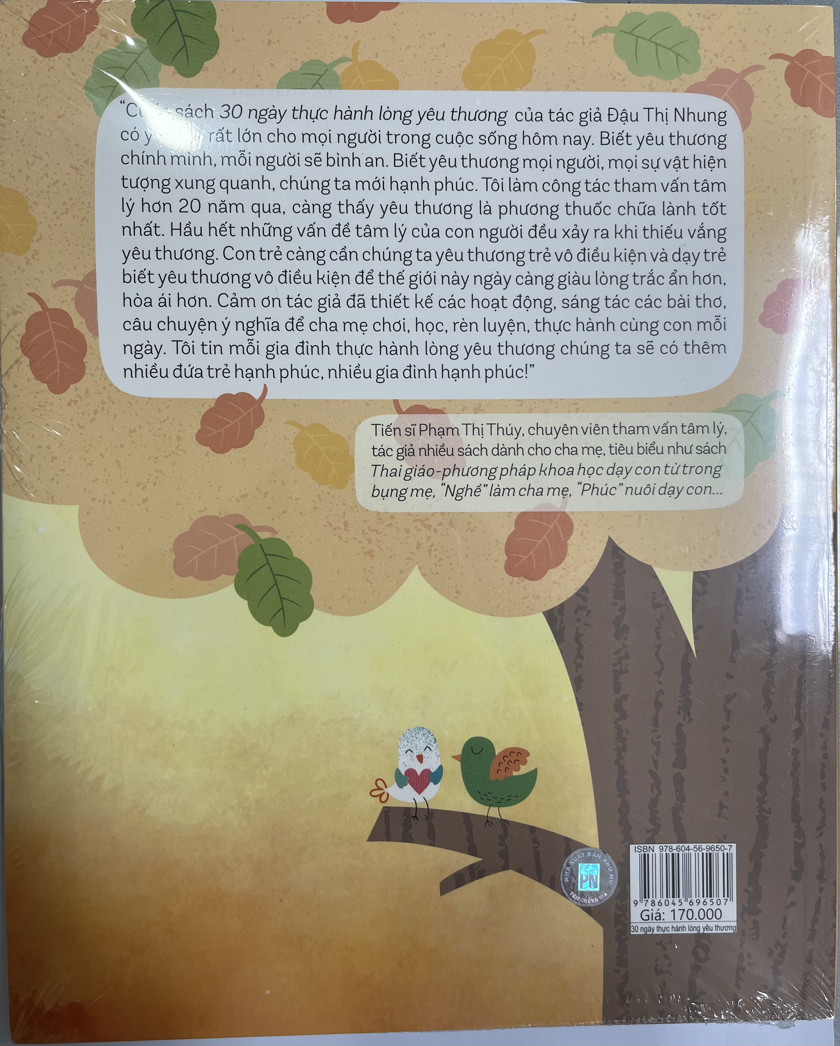 I.GIỚI THIỆU SÁCH “Cuốn sách 30 Ngày Thực Hành Lòng Yêu Thương của tác giả Đậu Thị Nhung có ý nghĩa rất lớn cho mọi người trong cuộc sống hôm nay. Biết yêu thương chính mình, mỗi người sẽ bình an. Biết yêu thương mọi người, mọi sự vật hiện tượng xung quanh, chúng ta mới hạnh phúc. Tôi làm công tác tham vấn tâm lý hơn 20 năm qua, càng thấy yêu thương là phương thuốc chữa lành tốt nhất. Hầu hết những vấn đề tâm lý của con người đều xảy ra khi thiếu vắng yêu thương. Con trẻ càng cần chúng ta yêu thương trẻ vô điều kiện và dạy trẻ biết yêu thương vô điều kiện để thế giới này ngày càng giàu lòng trắc ẩn hơn, hòa ái hơn. Cảm ơn tác giả đã thiết kế các hoạt động, sáng tác các bài thơ, câu chuyện ý nghĩa để cha mẹ chơi, học, rèn luyện, thực hành cùng con mỗi ngày. Tôi tin mỗi gia đình thực hành lòng yêu thương chúng ta sẽ có thêm nhiều đứa trẻ hạnh phúc, nhiều gia đình hạnh phúc!”” -- Tiến sĩ Phạm Thị Thúy, chuyên viên tham vấn tâm lý, tác giả nhiều sách dành cho cha mẹ II.THÔNG TIN CHI TIẾT Mã hàng 9786045681961 Tên Nhà Cung Cấp Phụ Nữ Tác giả Đậu Thị Nhung, Hoa Quỳnh NXB NXB Phụ Nữ Việt Nam Năm XB 2021 Trọng lượng (gr) 385 Kích Thước Bao Bì 25.5 x 20.5 x 1 cm Số trang 112 Hình thức Bìa Mềm