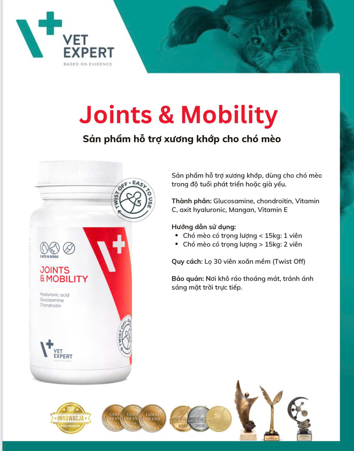 Mua tại Tiktok- Xuất xứ: BA LAN -Sản phẩm hỗ trợ miễn dịch chó mèo Sản phẩm giúp hỗ trợ miễn dịch không đặc hiệu cho chó và mèo Dùng cho thú cưng bị căng thẳng như chó con đang lớn, chó già, chó tăng nguy cơ nhiễm trùng do virus hoặc vi khuẩn gây bệnh, chó cái trong thai kì nhằm kích thích chế độ miễn dịch từ mẹ truyền sang con Thành phần: HMB-Ca, β-glucan, chiết xuất hoa cúc tím. Hướng dẫn sử dụng: Chó mèo có trọng lượng < 15kg: 1 viên Chó mèo có trọng lượng > 15kg: 2 viên Quy cách: lọ 30 viên. Bảo quản: nơi khô ráo thoáng mát, tránh ánh sáng mặt trời trực tiếp. Joints & Mobility Sản phẩm hỗ trợ xương khớp cho chó mèo Khuyến khích dùng cho chó mèo trong độ tuổi phát triển hoặc già yếu. Thành phần: Glucosamine, chondroitin, Vitamin C, axit hyaluronic, Mangan, vitamin E Multivitamin Sản phẩm bổ sung vitamin và khoáng cho chó mèo Sản phẩm bao gồm các vitamin thiết yếu khoáng chất cần thiết cho cơ thể. Lưu ý không cho ăn vượt quá hàm lượng dinh dưỡng tiêu chuẩn mỗi ngày. Sản phẩm phù hợp cho chó mèo ở mọi lứa tuổi. Thành phần: Vitamin B3, kẽm, vitamin E Sắt, Vitamin B1, vitamin B2, vitamin B6, Mangan, đồng, axit folic, biotin, vitamin B12, vitamin A, vitamin D3. Skin & Coat Sản phẩm dành cho chó mèo có vấn đề về lông da Hỗ trợ chức năng lông da ở chó mèo. Khuyến cáo dùng cho chó mèo bị khô lông, rụng lông, xỉn màu, da khô, ngứa ngáy, khó chịu. Thành phần: Omega 3, omega 6, kẽm, vitamin E, biotin, vitamin A. Sản phẩm này là tài sản cá nhân được bán bởi Nhà Bán Hàng Cá Nhân và không thuộc đối tượng phải chịu thuế GTGT. Do đó hoá đơn VAT không được cung cấp trong trường hợp này.