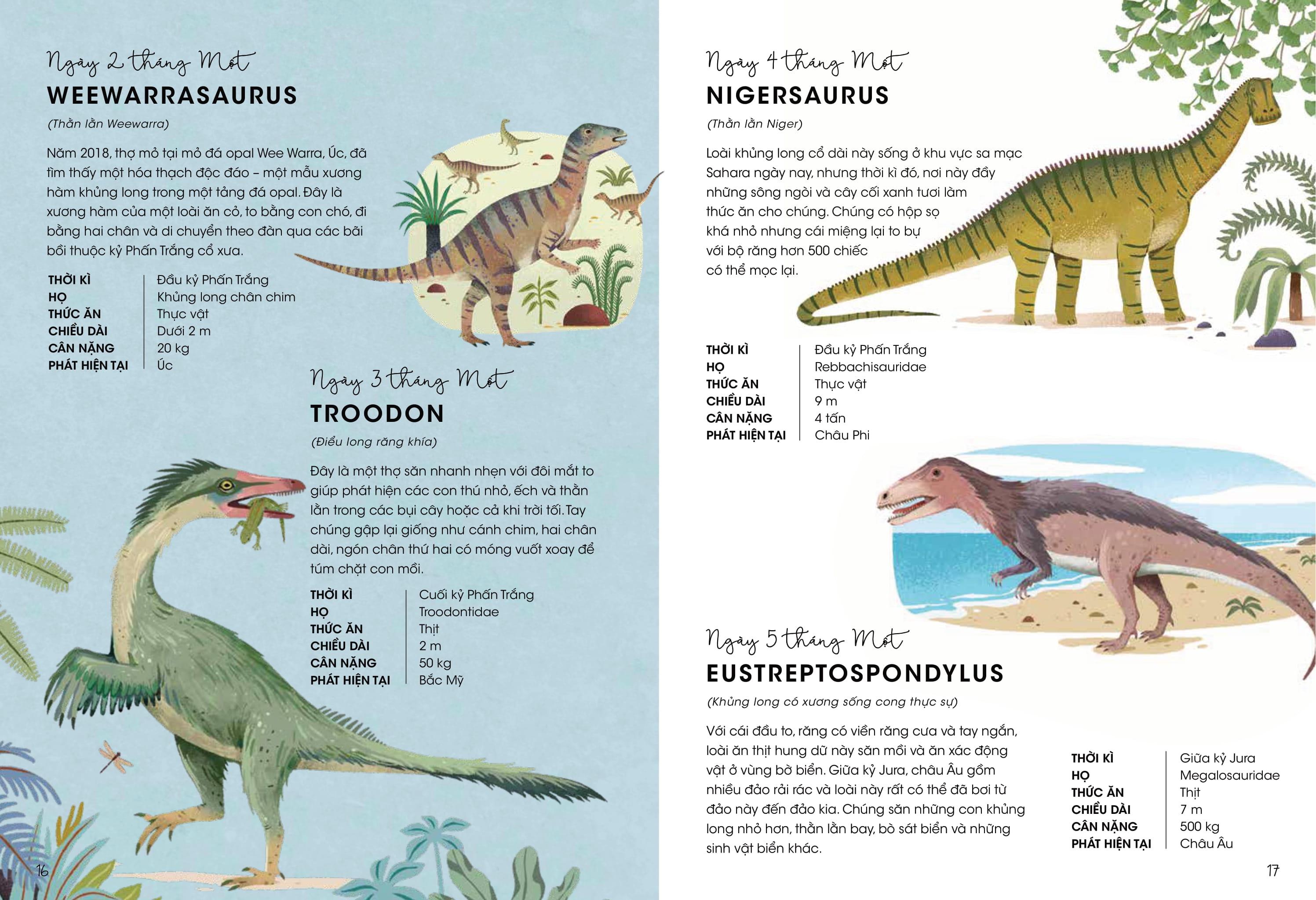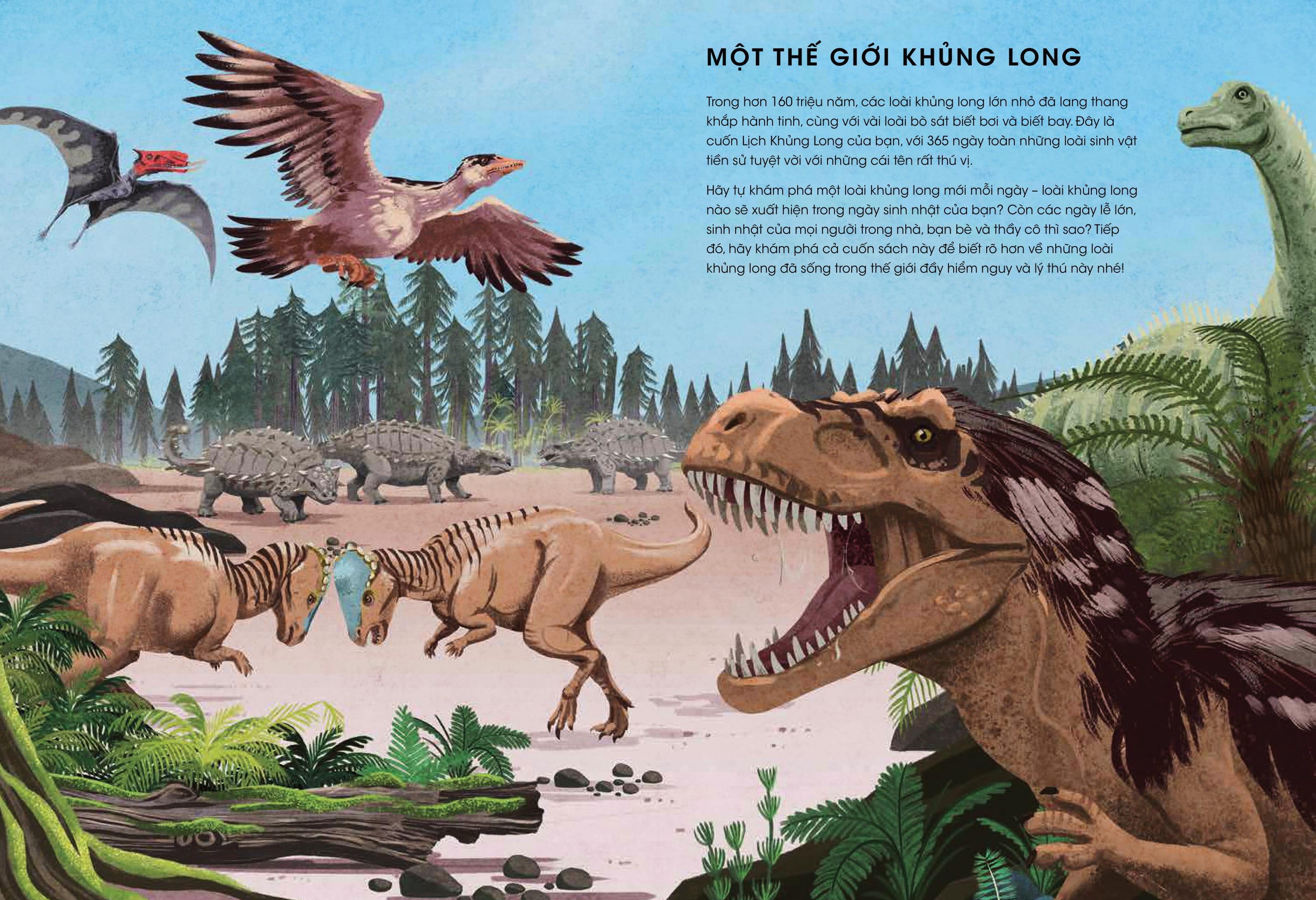 365 Ngày Khủng Long Cuốn sách ‘365 ngày khủng long’ mời bạn cùng du hành vào một thế giới cổ xưa và kỳ lạ. Trong cuộc gặp gỡ khó quên kéo dài suốt 365 ngày này, bạn sẽ được gặp đủ các loài khủng long, từ hiền lành tới hung dữ, từ nhỏ bằng bàn tay cho tới lớn như tòa nhà. Bạn sẽ thấy những cái tên quen thuộc và lạ lẫm, cùng với những loài mới được phát hiện, tất cả đều trở nên sống động với những hình ảnh minh họa tuyệt đẹp và các thông tin hấp dẫn.