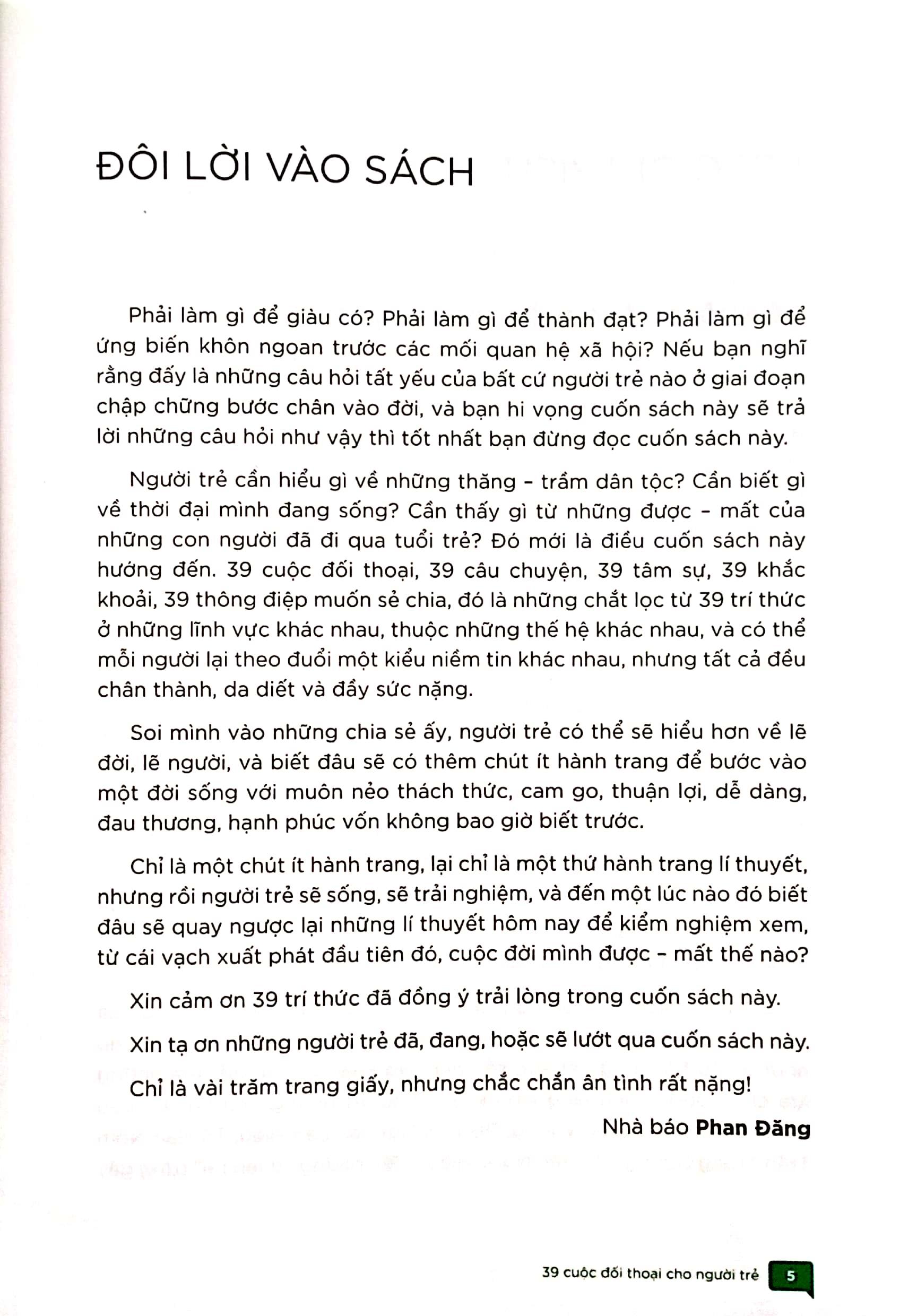 Người trẻ ngày nay phải đối diện trước vô vàn lựa chọn, làm thế nào chúng ta có thể đưa ra lựa chọn đúng đắn và hợp lí ở giai đoạn chập chững bước vào đời? Người trẻ nên sống như thế nào trong thời đại mới? Nên tin và lựa chọn thế nào trong xã hội đầy biến động? Chúng ta phải học ra sao để chung sống với những sản phẩm công nghệ ngày càng thông minh hơn? Câu trả lời chính là học hỏi kinh nghiệm và tiếp thu tri thức từ những bậc tiền bối đi trước. 39 Cuộc Đối Thoại Cho Người Trẻ là 39 câu chuyện, 39 tâm sự, 39 khắc khoải, 39 thông điệp muốn sẻ chia, được chắt lọc từ kinh nghiệm và vốn sống dạn dày của 39 trí thức trong những lĩnh vực khác nhau, thuộc nhiều thế hệ khác nhau. Tuy mỗi người theo đuổi một lĩnh vực tri thức khác nhau, nhưng tựu trung lại, tất cả đều bày tỏ niềm tin chân thành, da diết và đầy sức nặng. 39 Cuộc Đối Thoại Cho Người Trẻ sẽ cùng bạn đi đến tận cùng của rất nhiều vấn đề, hiện tượng nổi cộm trong cuộc sống xã hội đương đại. Xuyên suốt cuốn sách, bạn đọc được lắng nghe câu chuyện, nhìn nhận vấn đề dưới nhiều lăng kính khác nhau, từ những nhà nghiên cứu như GS TS Trần Ngọc Vương, PGS TS Nguyễn Lân Hiếu… đến những “thiên tài” từng gây chấn động như Lê Bá Khánh Trình, Phạm Kim Hùng, cả những văn nghệ sĩ đầy sức ảnh hưởng như ca sĩ Tùng Dương, nhà văn Nguyễn Bình Phương và cả những người hoạch định chính sách và giữ vị trí quan trọng là Đại sứ Mĩ tại Việt Nam ông Daniel J. Kritenbrink, người phát ngôn Bộ Ngoại giao Việt Nam Lê Thị Thu Hằng… Thông qua những chia sẻ trong 39 Cuộc Đối Thoại Cho Người Trẻ, bạn đọc có thể hiểu hơn về lẽ đời, lẽ người, và biết đâu sẽ có thêm chút ít hành trang để bước vào một đời sống với muôn nẻo thách thức, cam go, thuận lợi, dễ dàng, đau thương, hạnh phúc vốn không bao giờ biết trước.