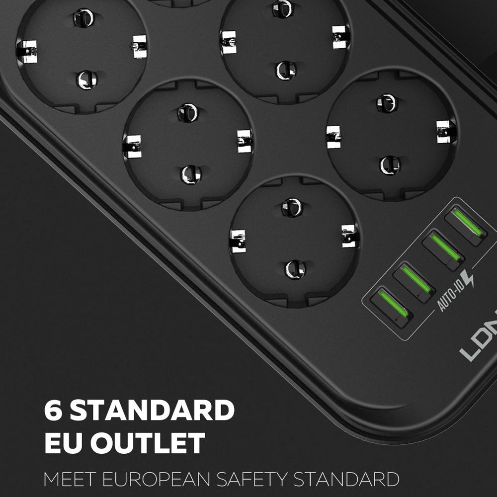 Equipped with 6 power sockets and 4 USB, suitable for chargings smartphones, tablets, desk lamps, computers and other devices at the same time, fine for home, office, in the workshop. Features: With 6 standard EU
