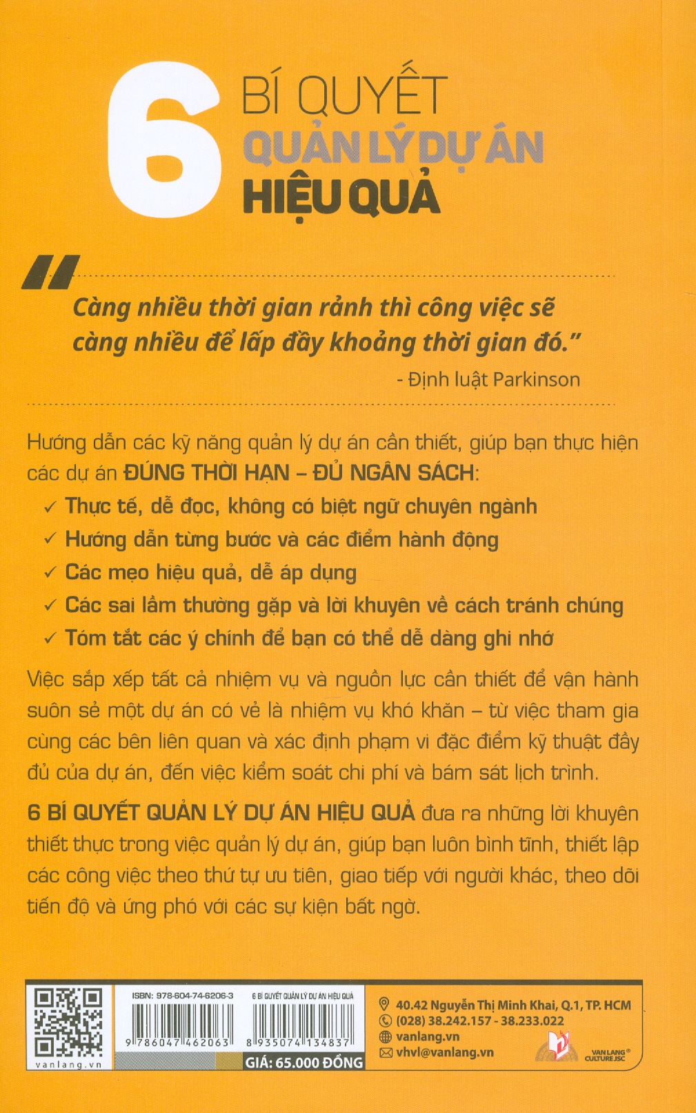 - Định luật Parkinson Hướng dẫn các kỹ năng quản lý dự án cần thiết, giúp bạn thực hiện các dự án ĐÚNG THỜI HẠN – ĐỦ NGÂN SÁCH: Thực tế, dễ đọc, không có biệt ngữ chuyên ngành Hướng dẫn từng bước và các điểm hành động Các mẹo hiệu quả, dễ áp dụng Các sai lầm thường gặp và lời khuyên về cách tránh chúng Tóm tắt các ý chính để bạn có thể dễ dàng ghi nhớ Việc sắp xếp tất cả nhiệm vụ và nguồn lực cần thiết để vận hành suôn sẻ một dự án có vẻ là nhiệm vụ khó khăn – từ việc tham gia cùng các bên liên quan và xác định phạm vi đặc điểm kỹ thuật đầy đủ của dự án, đến việc kiểm soát chi phí và bám sát lịch trình. "6 bí quyết quản lý dự án hiệu quả"đưa ra những lời khuyên thiết thực trong việc quản lý dự án, giúp bạn luôn bình tĩnh, thiết lập các công việc theo thứ tự ưu tiên, giao tiếp với người khác, theo dõi tiến độ và ứng phó với các sự kiện bất ngờ.