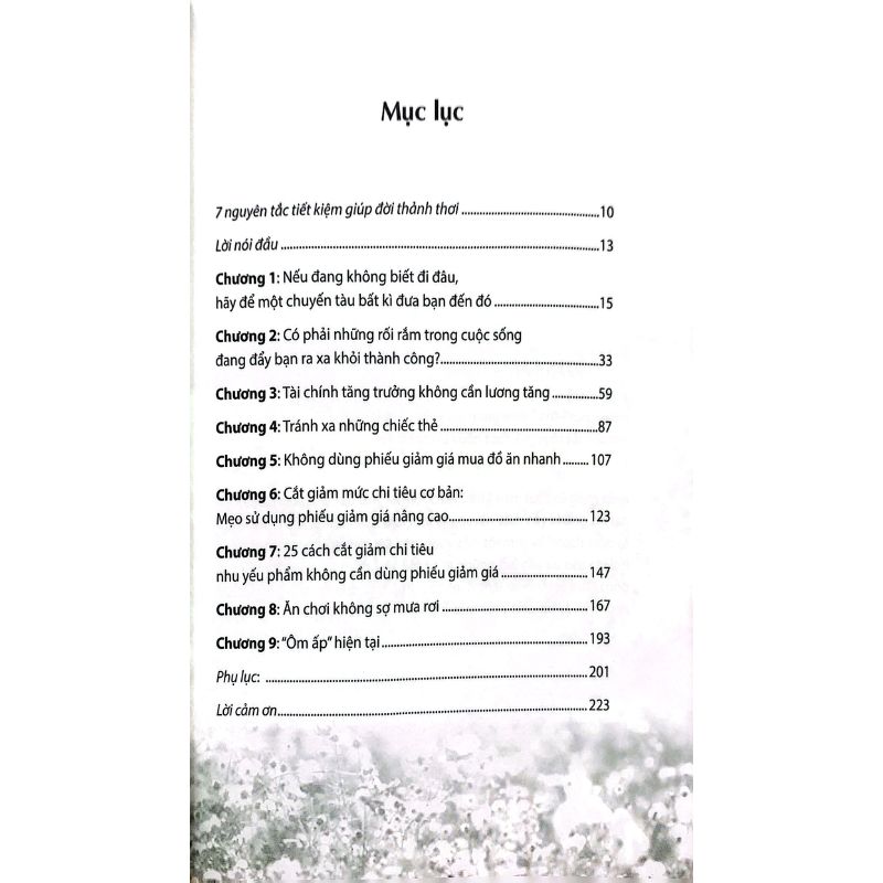 Bên cạnh đó, bằng cách cung cấp những lời khuyên hữu ích và thiết thực, cuốn sách cũng giúp người đọc thay đổi cái nhìn “tiết kiệm đồng nghĩa keo kiệt, bủn xỉn” để thảnh thơi vui sống, từ việc đi ăn nhà hàng sao cho vừa ngon miệng vừa có giá cả phải chăng, cho đến đi du lịch cùng với cả gia đình mà không phải quá lo lắng về các hóa đơn, chi phí phát sinh ngoài dự kiến.