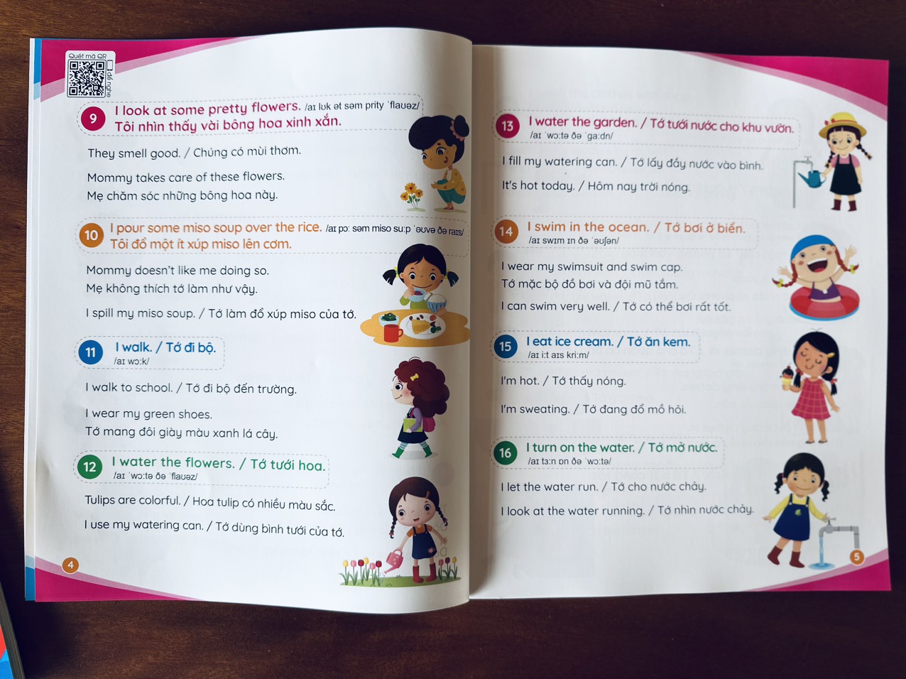 - Năm xuất bản : 2023 Giới thiệu sách: 900 câu giao tiếp Tiếng Anh thường dùng hàng ngày - Cẩm nang cho mẹ cùng con học tiếng anh mỗi ngày (song ngữ Anh – Việt) File nghe Quét mã QR Cuốn sách gồm 900 câu đàm thoại tiếng Anh để cha mẹ cùng con có thể giao tiếp về các chủ đề xung quanh cuộc sống hằng ngày, từ lúc thức dậy vào buổi sáng, đi học, đi chơi, đi siêu thị … cho đến lúc đi ngủ. Có cuốn sách này thì cha mẹ không lo bí từ, không biết nói tiếng Anh như thế nào cùng con. Đây là cuốn cẩm nang giúp cho cha mẹ có cơ hội học tập và giao tiếp tiếng Anh cùng con, để cả hai cùng tiến bộ mỗi ngày. Sách có kèm file nghe quét mã QR với giọng đọc tiếng Anh chuẩn để cha mẹ và con cùng nghe và tắm ngôn ngữ mỗi ngày.