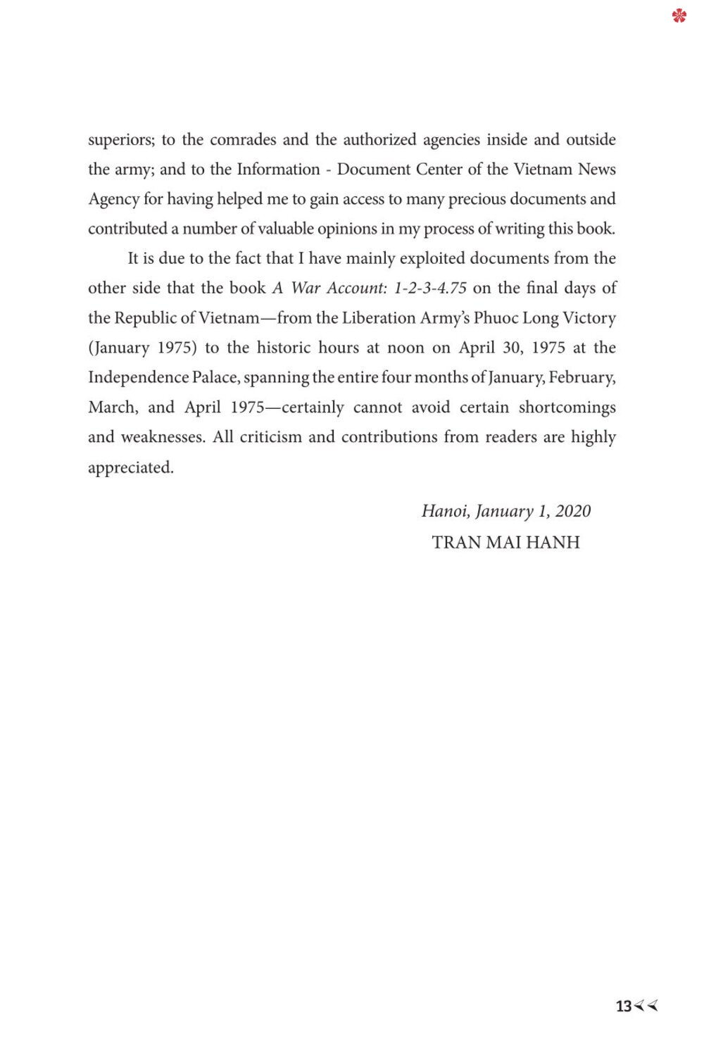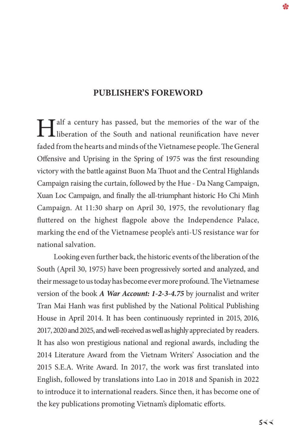 Looking even further back, the historic events of the liberation of the South (April 30, 1975) have been progressively sorted and analyzed, andtheir message to us today has become ever more profound. The Vietnamese version of the book A War Account: 1-2-3-4.75 by journalist and writer Tran Mai Hanh was first published by the  National Political Publishing House in April 2014. It has been continuously reprinted in 2015, 2016,2017, 2020 and 2025, and well-received as well as highly appreciated by readers. It has also won prestigious national and regional awards, including the2014 Literature Award from the Vietnam Writers’ Association and the 2015 S.E.A. Write Award. In 2017, the work was first translated into English, followed by translations into Lao in 2018 and Spanish in 2022 to introduce it to international readers. Since then, it has become one of the key publications promoting Vietnam’s diplomatic efforts.