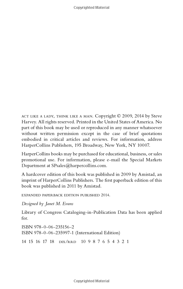 With liberal use of his own adventures in love and courtship, Act Like a Lady, Think Like a Man is an honest, compelling, and realistic examination of how men think about love and sex and what women need to know so that they can set realistic expectations of the men in their life.