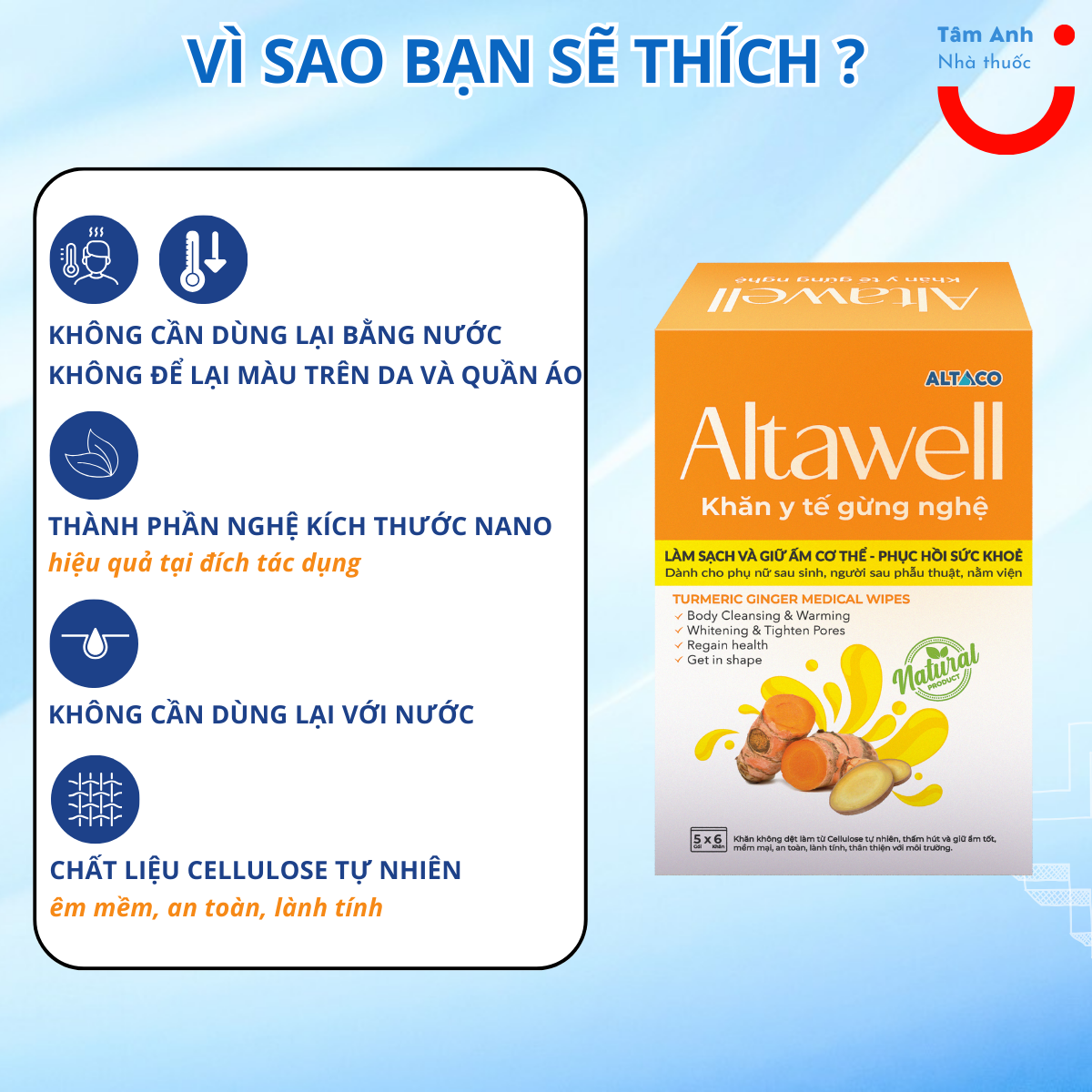 Công dụng của khăn gừng nghệ Altawell Sản phẩm được phát triển và cải tiến từ rượu cốt gừng nghệ dân gian. Sản phẩm hỗ trợ làm sạch, làm ẩm cơ thể, ngăn ngừa cảm lạnh phục hồi sức khỏe sau sinh. – Làm sạch và ấm cơ thể, tránh cảm lạnh, phục hồi nhanh sức khỏe sau sinh – Làm sáng da, mờ vết thâm, vết rạn hoặc sẹo do quá trình sinh mổ, se khít lỗ chân lông, giúp cải thiện làn da trắng hồng tự nhiên Tuy nhiên, tùy thuộc vào cơ địa mà tác dụng sẽ khác nhau Thành phần của khăn gừng nghệ Altawell