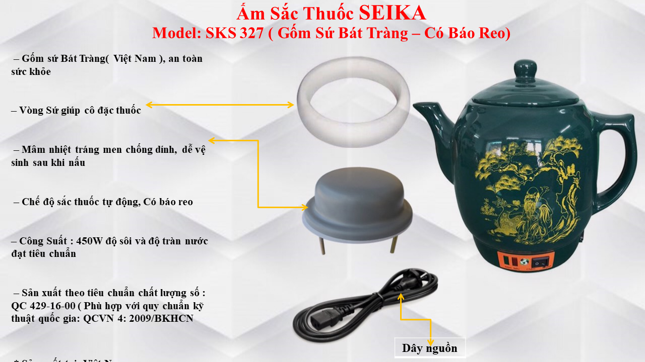 - Công suất: 300W - Dung tích: 3 lít - Điện Thế/ tần số: 220V/50Hz - Chất liệu: Gốm Bát Tràng Việt Nam - Men không phai màu - Thuốc nấu ra hết, tiết kiệm