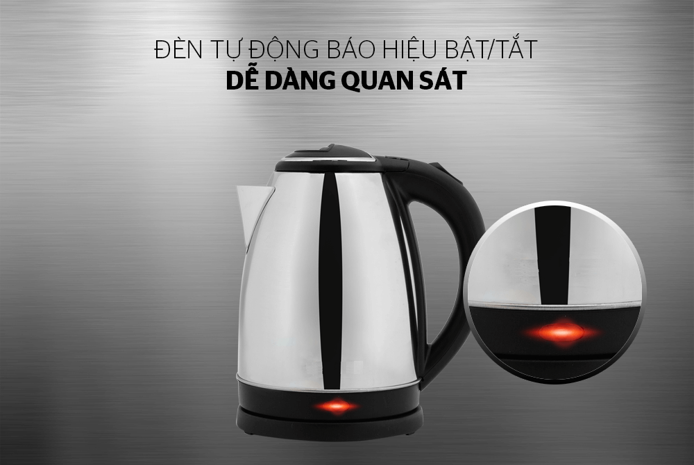 ĐẶC ĐIỂM NỔI BẬT - Đèn báo hiệu bật tắt - Tự động tắt khi sôi hoặc trào nước trong lúc đun - Thân ấm bằng thép không gỉ - Cấu tạo đế xoay 360