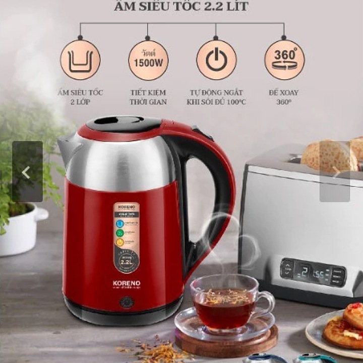 Ấm đun nước là một vật dụng không thể thiếu trong mỗi gia đình và trong cuộc sống hiện đại như hiện nay. Ấm đun nước siêu tốc tiện lợi và gọn nhẹ đang là sự lựa chọn hàng đầu của các gia đình. Nếu bạn đang băn khoăn chưa biết nên chọn lựa sản phẩm nào thì Ấm đun nước siêu tốc 02 lớp cao cấp KORENO 2,2L, cách điện, cách nhiệt, siêu bền sẽ là lựa chọn lý tưởng cho bạn. CÁC ĐẶC ĐIỂM NỔI BẬT:
