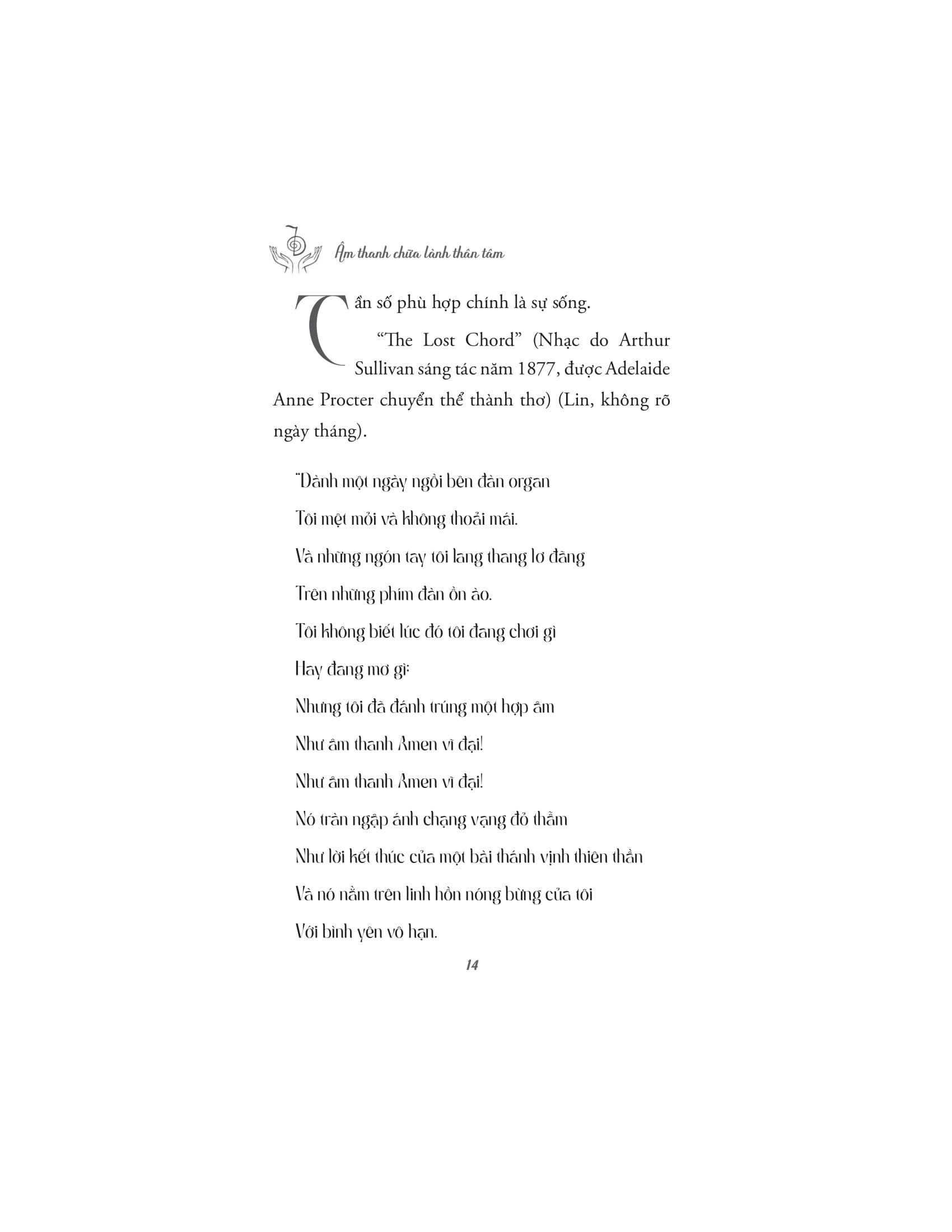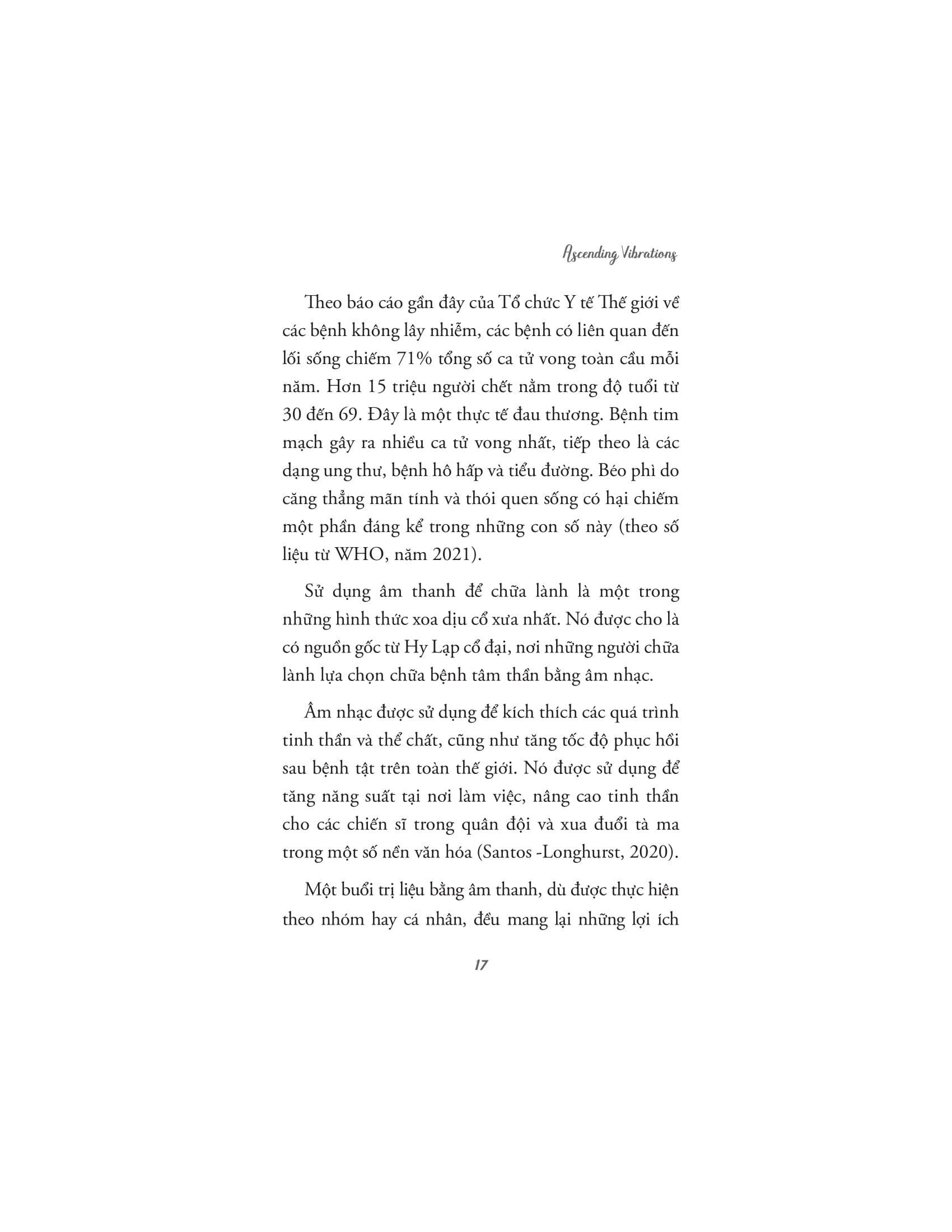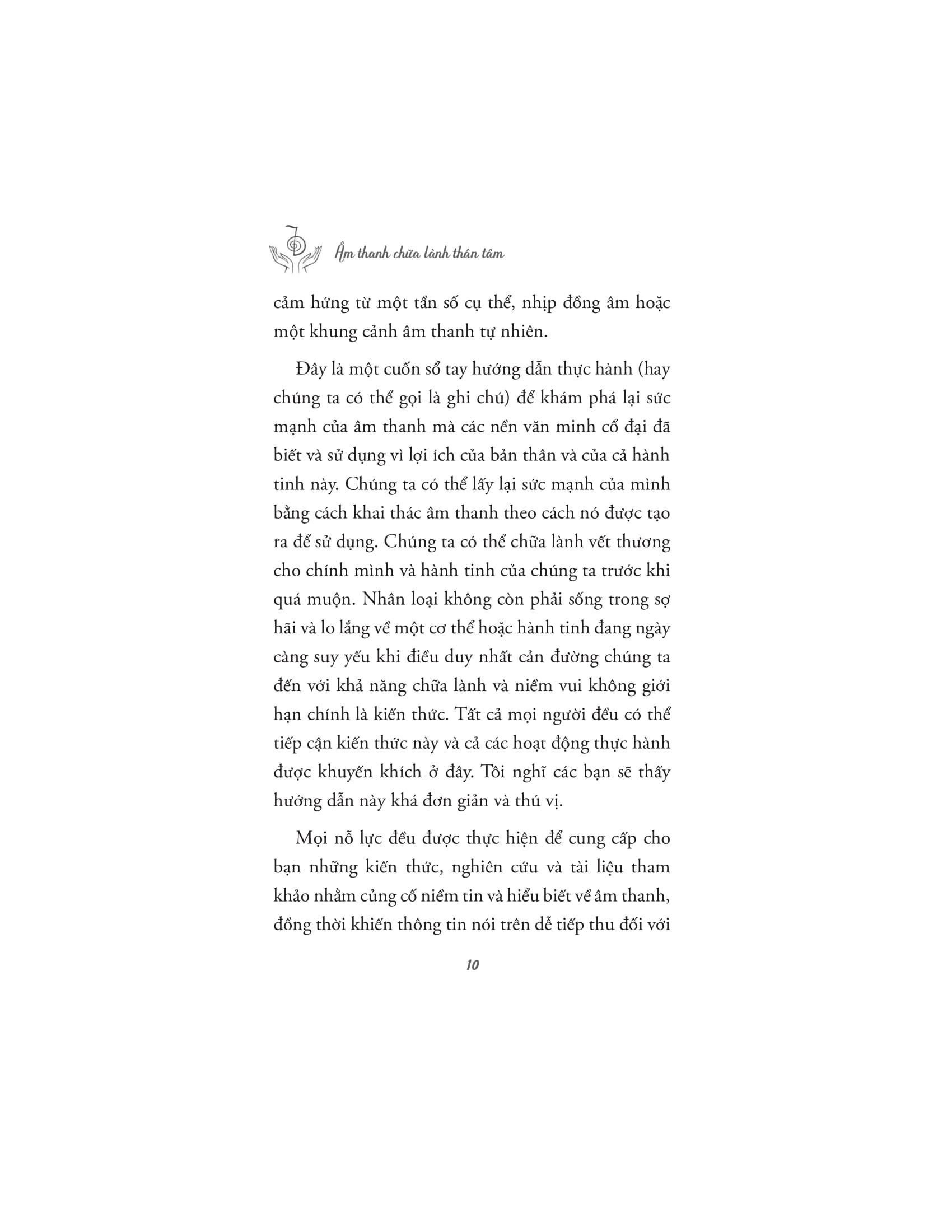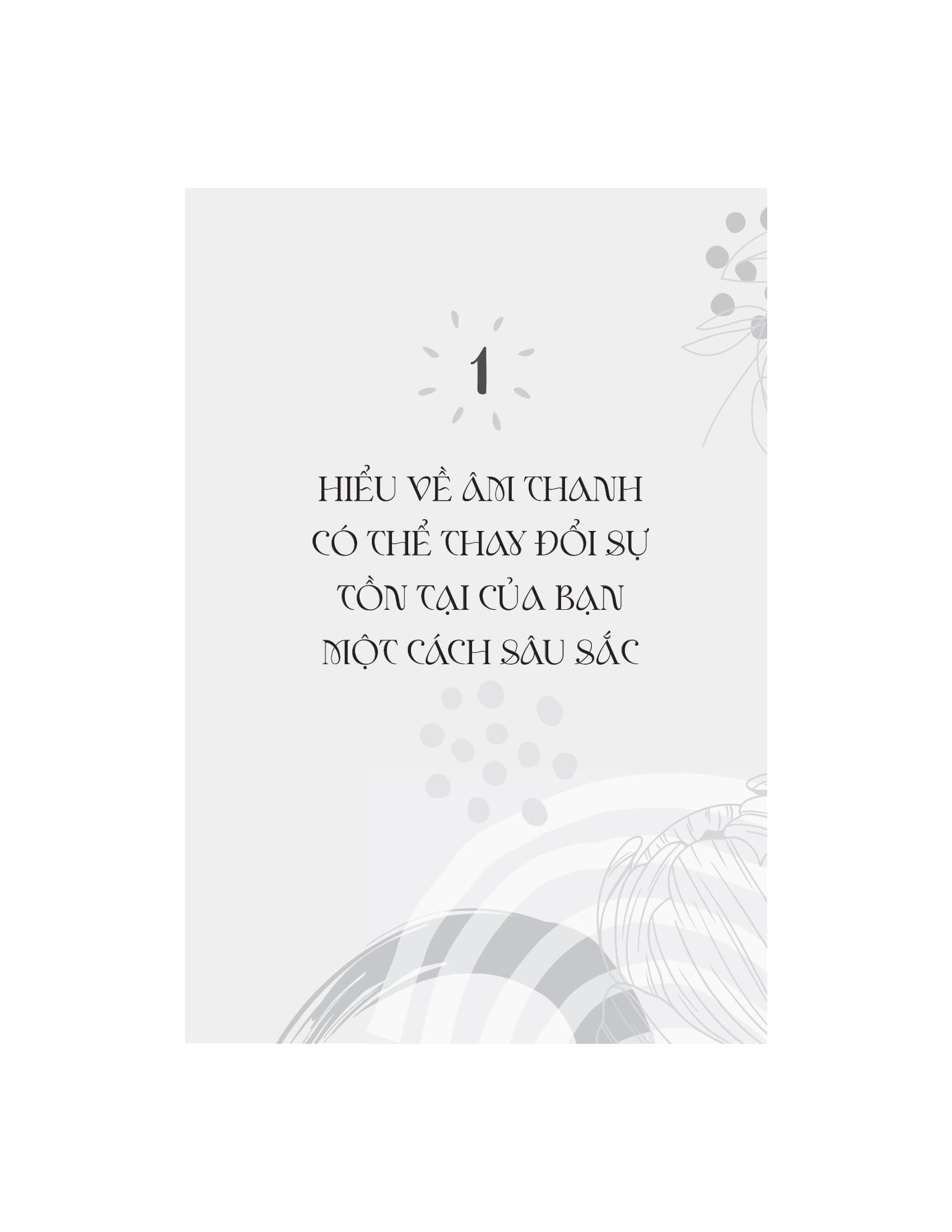 Tác giả dẫn dắt người đọc qua những ứng dụng khoa học, tâm linh và siêu hình của âm thanh, giải thích cách mà các liệu pháp âm thanh cổ xưa đã được sử dụng trong nhiều nền văn hóa khác nhau để chữa lành và cải thiện sức khỏe. Âm thanh không chỉ có khả năng tác động đến cảm xúc, mà còn có thể ảnh hưởng tích cực đến hệ thần kinh, hệ miễn dịch, và thậm chí là các luân xa, trung tâm năng lượng trong cơ thể con người. Với nhiều kỹ thuật và phương pháp trị liệu âm thanh khác nhau, những liệu pháp này giúp cơ thể thư giãn, giảm căng thẳng, loại bỏ tắc nghẽn năng lượng và khôi phục lại trạng thái cân bằng tự nhiên.