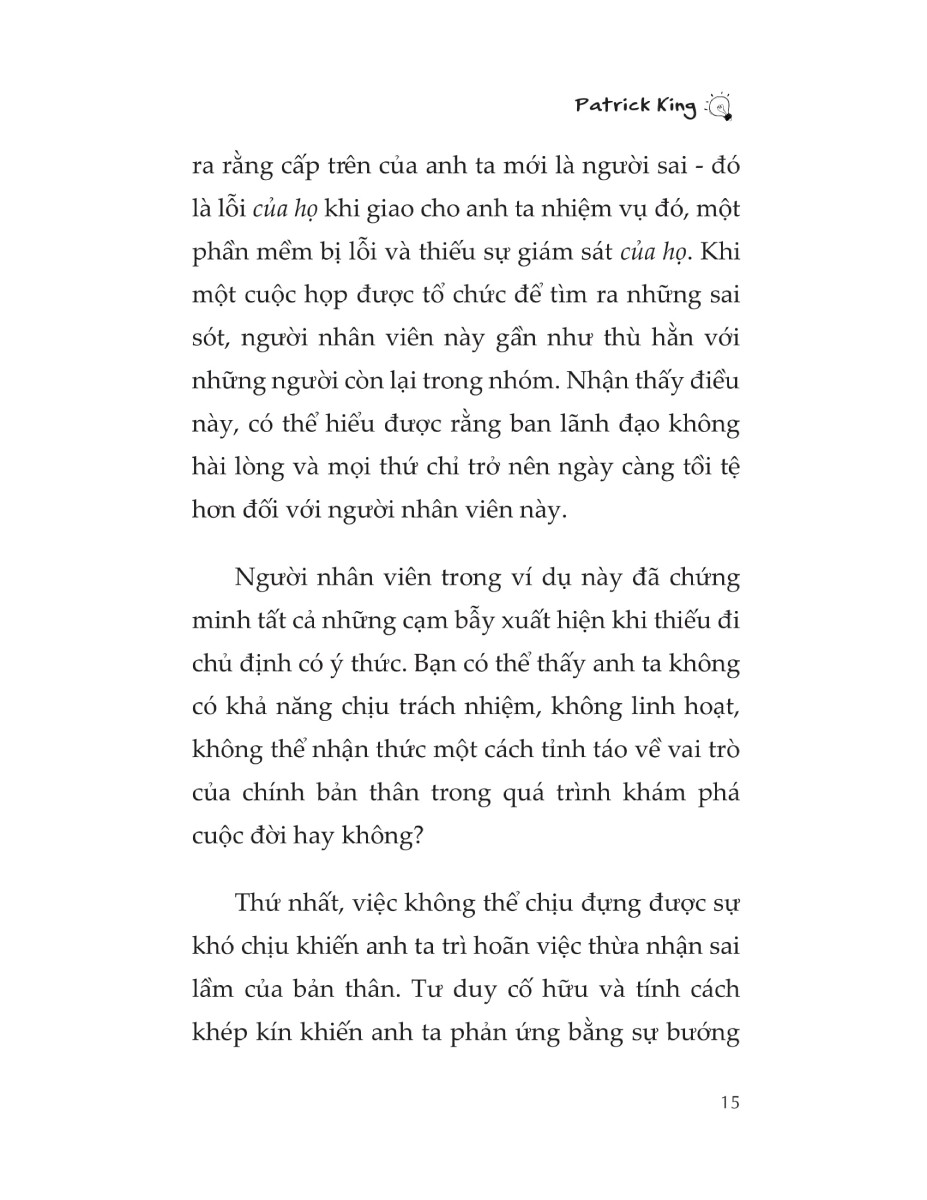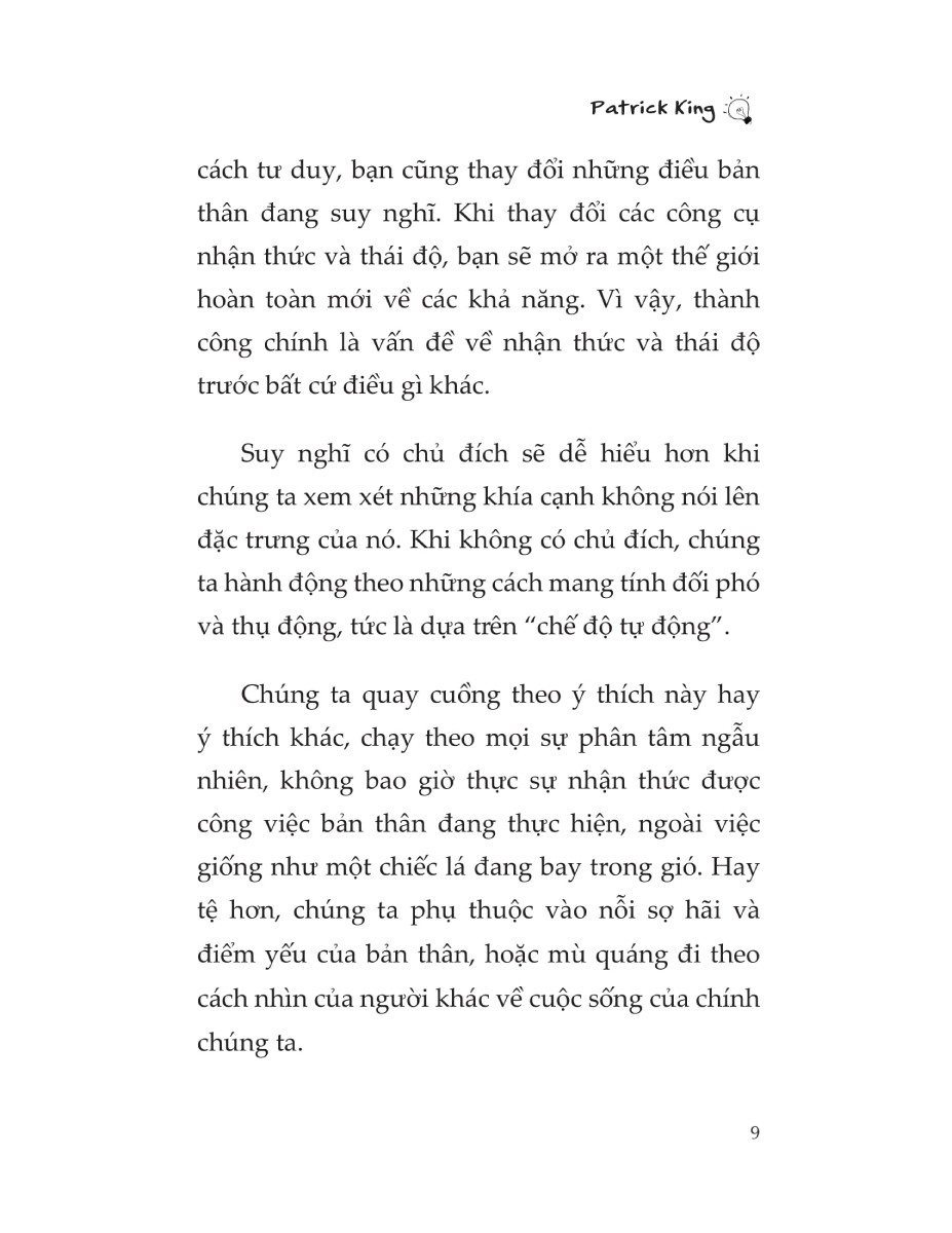 Ám Thị Tâm Lý Chúng ta có thể dành thời gian để cố gắng kiểm soát các sự kiện trong cuộc sống của mình một cách gián tiếp, nhưng thách thức thực sự là tiếp cận bên trong một cách sâu sắc hơn để kiểm. soát bản thân ở mức độ cơ bản hơn. Khi thay đổi cách tư duy, bạn cũng thay đổi những điều bản thân đang suy nghĩ. Khi thay đổi các công cụ nhận thức và thái độ, bạn sẽ mở ra một thế giới hoàn toàn mới về các khả năng. Vì vậy, thành công chính là vấn đề về nhận thức và thái độ trước bất cứ điều gì khác. Suy nghĩ có chủ đích sẽ dễ hiểu hơn khi chúng ta xem xét những khía cạnh không nói lên đặc trưng của nó. Khi không có chủ đích, chúng ta hành động theo những cách mang tính đối phó và thụ động, tức là dựa trên “chế độ tự động”. Chúng ta quay cuồng theo ý thích này hay ý thích khác, chạy theo mọi sự phân tâm ngẫu nhiên, không bao giờ thực sự nhận thức được công việc bản thân đang thực hiện, ngoài việc giống như một chiếc lá đang bay trong gió. Hay tệ hơn, chúng ta phụ thuộc vào nỗi sợ hãi và điểm yếu của bản thân, hoặc mù quáng đi theo cách nhìn của người khác về cuộc sống của chính chúng ta. Chúng ta không thể kiểm soát người khác, chúng ta không thể kiểm soát phần lớn thế giới bên ngoài, nhưng chúng ta có thể kiểm soát suy nghĩ của mình, và điều đó đủ để thay đổi cuộc sống của chúng ta. Thông thường, những hiểu biết sâu sắc nhất trong cuộc sống, những thay đổi mạnh mẽ nhất và những cải thiện lâu dài nhất xuất hiện khi chúng ta có đủ can đảm để hành động có chủ đích cũng như cân nhắc, chủ động hướng cuộc sống của mình đến với vị trí bản thân mong muốn. Với nhận thức tỉnh táo, chúng ta sử dụng chủ đích của bản thân để tập trung ý chí giống như một tia laser, để chúng ta có thể đạt được những điều bản thân mong muốn. Cuốn sách “Ám thị tâm lý” đi sâu vào khai thác xu hướng suy nghĩ của chúng ta, về cách chúng ta nên thay đổi và sắp xếp lại suy nghĩ của mình như thế nào để cảm thấy tự tin, mạnh mẽ, hạnh phúc và có trách nhiệm với cuộc sống của bản thân. Trong mỗi chương đều có lời khuyên hữu ích dành cho bạn để thực hiện ngay hôm nay. Những thay đổi tuy nhỏ và đơn giản nhưng lại có ý nghĩa rất lớn. Suy nghĩ quyết định hành động và hành động định hình nên thế giới. Thái độ của bạn tạo ra cảm giác về khả năng, cảm giác về con người và những gì bạn muốn (và xứng đáng!). Và những điều này sau đó tác động đến cách bạn diễn giải các sự kiện, phản ứng với chúng và hành động của riêng bạn. Thế giới ngoài kia là vậy, nhưng các sự kiện khách quan được chắt lọc thông qua tập hợp những kỳ vọng, niềm tin và khối tinh thần độc đáo của riêng bạn. Chúng ta không nhìn thế giới như nó vốn có, nhưng thế giới sẽ mang vẻ ngoài vốn có khi được truyền qua tư duy cụ thể của chúng ta. Nếu hành xử với sự tích cực, có chủ đích, nhận thức từ bi, tính linh hoạt, chúng ta sẽ tự nhiên thấy mình đang sống trong một thế giới khác so với khi chúng ta khép mình trong những suy nghĩ đầy sợ hãi, thói quen tiêu cực, thiếu tự tin, thụ động và vô tâm. Suy nghĩ có chủ đích là quyền bẩm sinh của bạn. Là một con người, bạn được sinh ra để nhận thức một cách có ý thức, tự chủ, làm chủ, hiểu biết và hành động có mục tiêu. Không ai khác có thể lựa chọn con đường cho chúng ta!