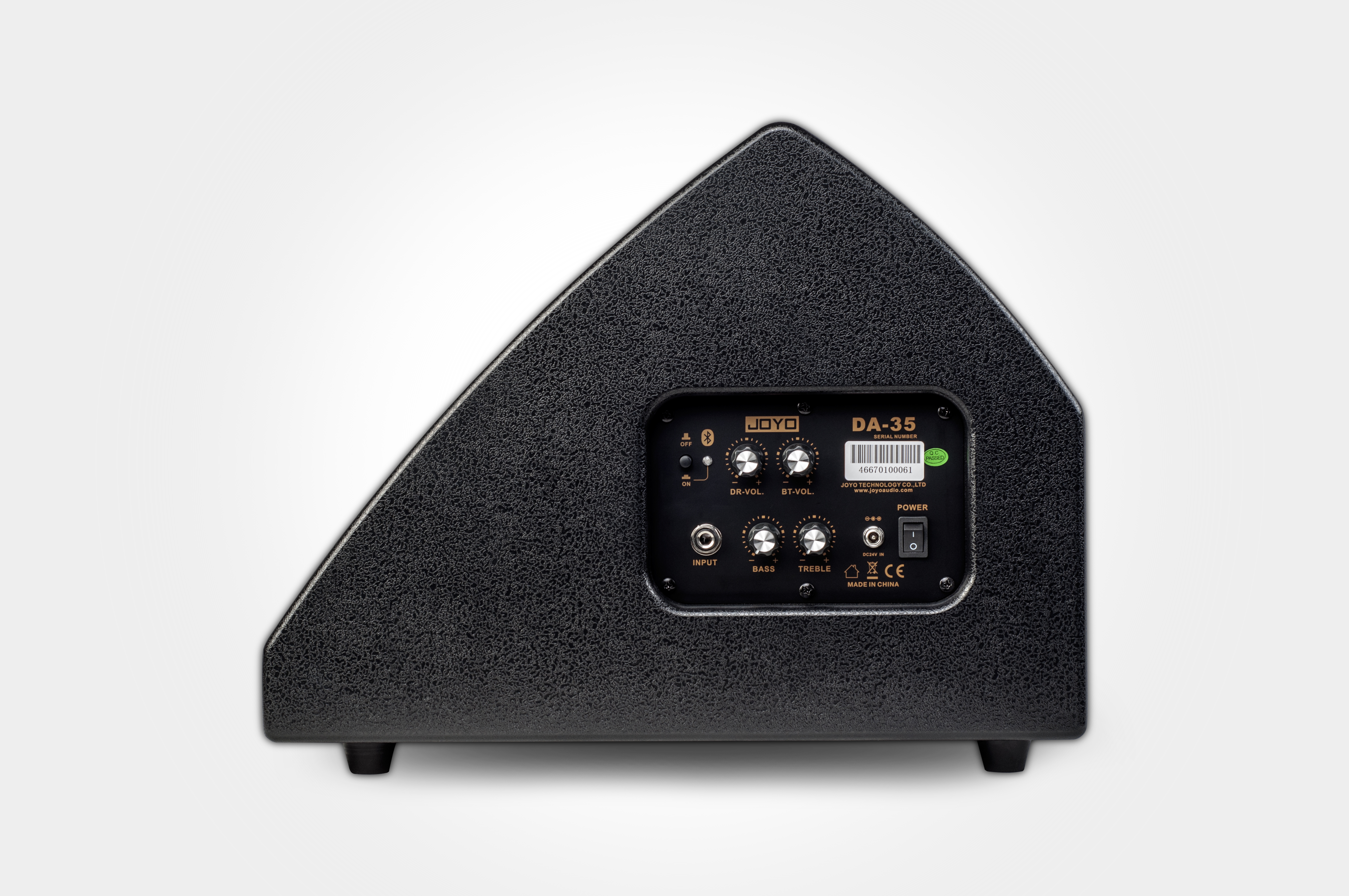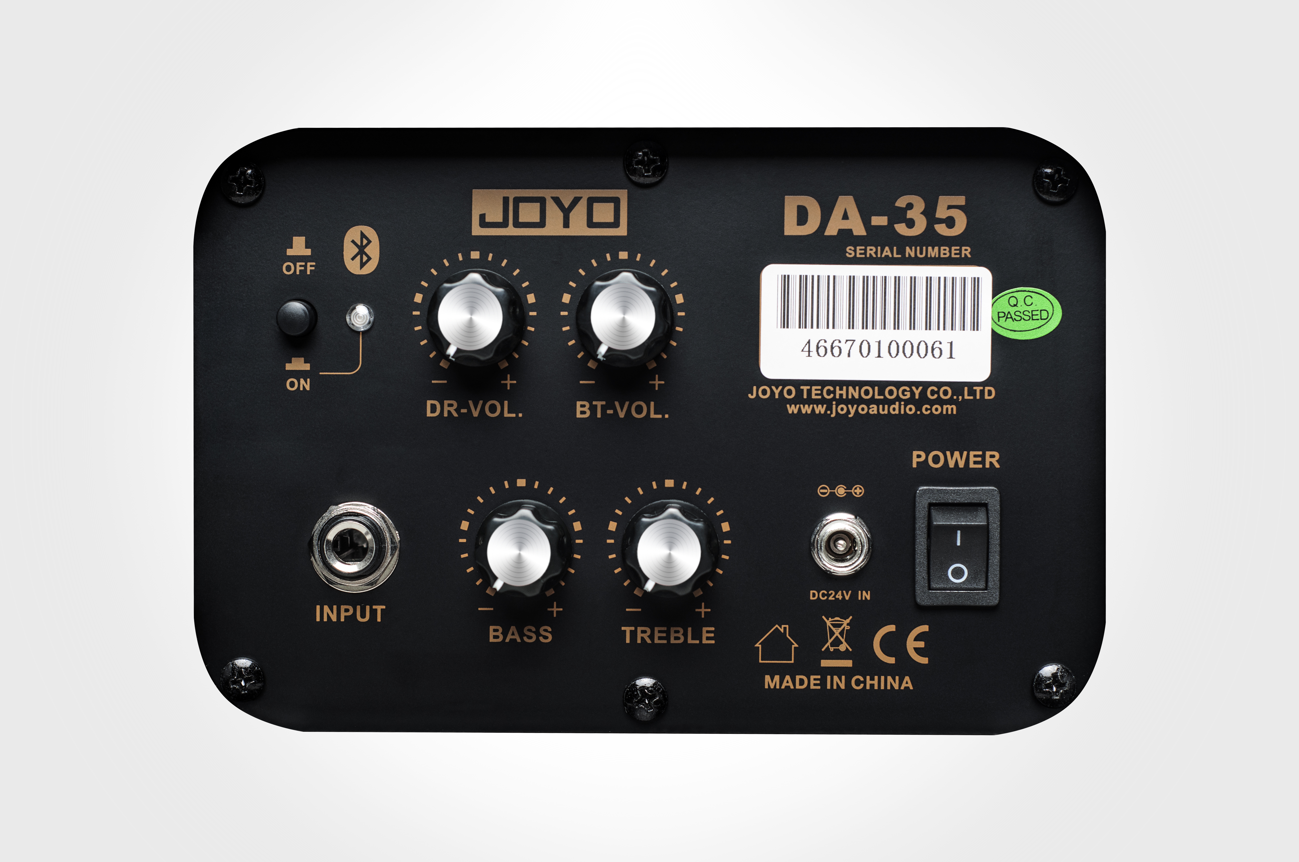 - Phần chỉnh ở bên cạnh có đầu vào giắc cắm, công tắc bluetooth, các mức âm lượng riêng biệt cho đầu vào (trống điện tử) và tín hiệu bluetooth, cũng như các điều khiển âm bổng và âm trầm EQ. Thông số kĩ thuật Joyo DA-35: