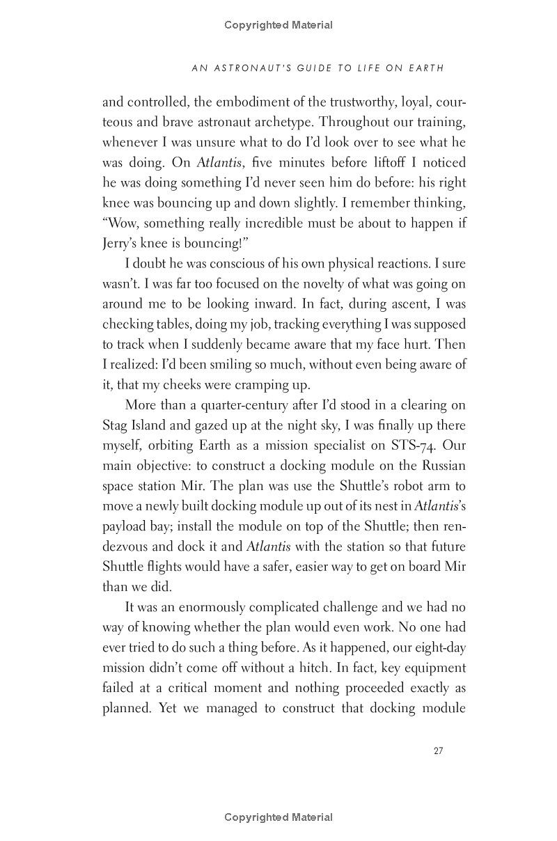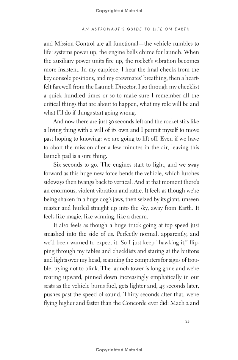An Astronaut's Guide to Life on Earth Travel to space and back with astronaut Chris Hadfield's "enthralling" bestseller as your eye-opening guide (Slate). Colonel Chris Hadfield has spent decades training as an astronaut and has logged nearly 4000 hours in space. During this time he has broken into a Space Station with a Swiss army knife, disposed of a live snake while piloting a plane, and been temporarily blinded while clinging to the exterior of an orbiting spacecraft. The secret to Col. Hadfield's success-and survival-is an unconventional philosophy he learned at NASA: prepare for the worst- and enjoy every moment of it. In An Astronaut's Guide to Life on Earth, Col. Hadfield takes readers deep into his years of training and space exploration to show how to make the impossible possible. Through eye-opening, entertaining stories filled with the adrenaline of launch, the mesmerizing wonder of spacewalks, and the measured, calm responses mandated by crises, he explains how conventional wisdom can get in the way of achievement -- and happiness. His own extraordinary education in space has taught him some counterintuitive lessons: don't visualize success, do care what others think, and always sweat the small stuff. You might never be able to build a robot, pilot a spacecraft, make a music video or perform basic surgery in zero gravity like Col. Hadfield. But his vivid and refreshing insights will teach you how to think like an astronaut, and will change, completely, the way you view life on Earth -- especially your own. "Hadfield proves himself to be not only a fierce explorer of the universe, but also a deeply thoughtful explorer of the human condition." --Maria Popova, Brain Pickings