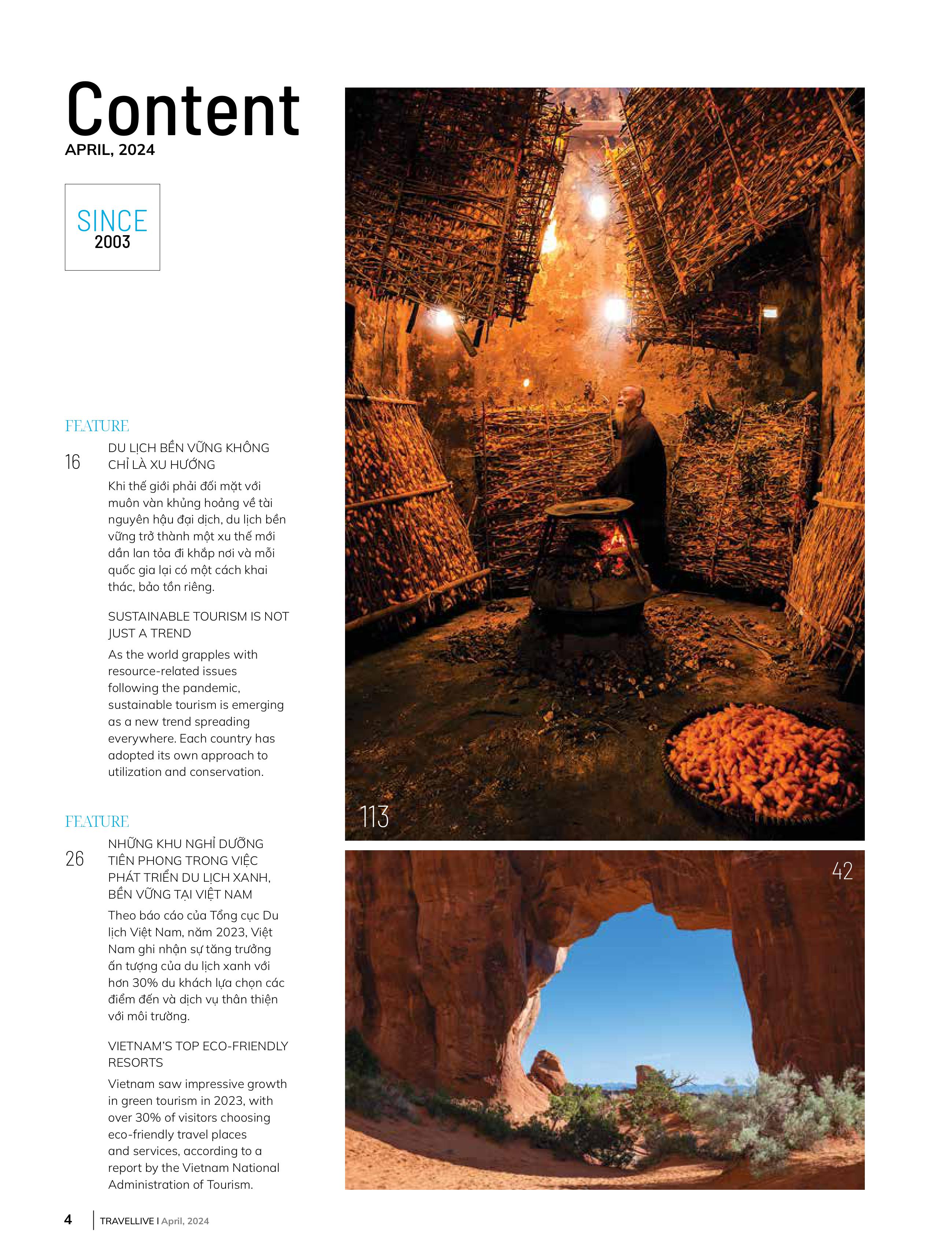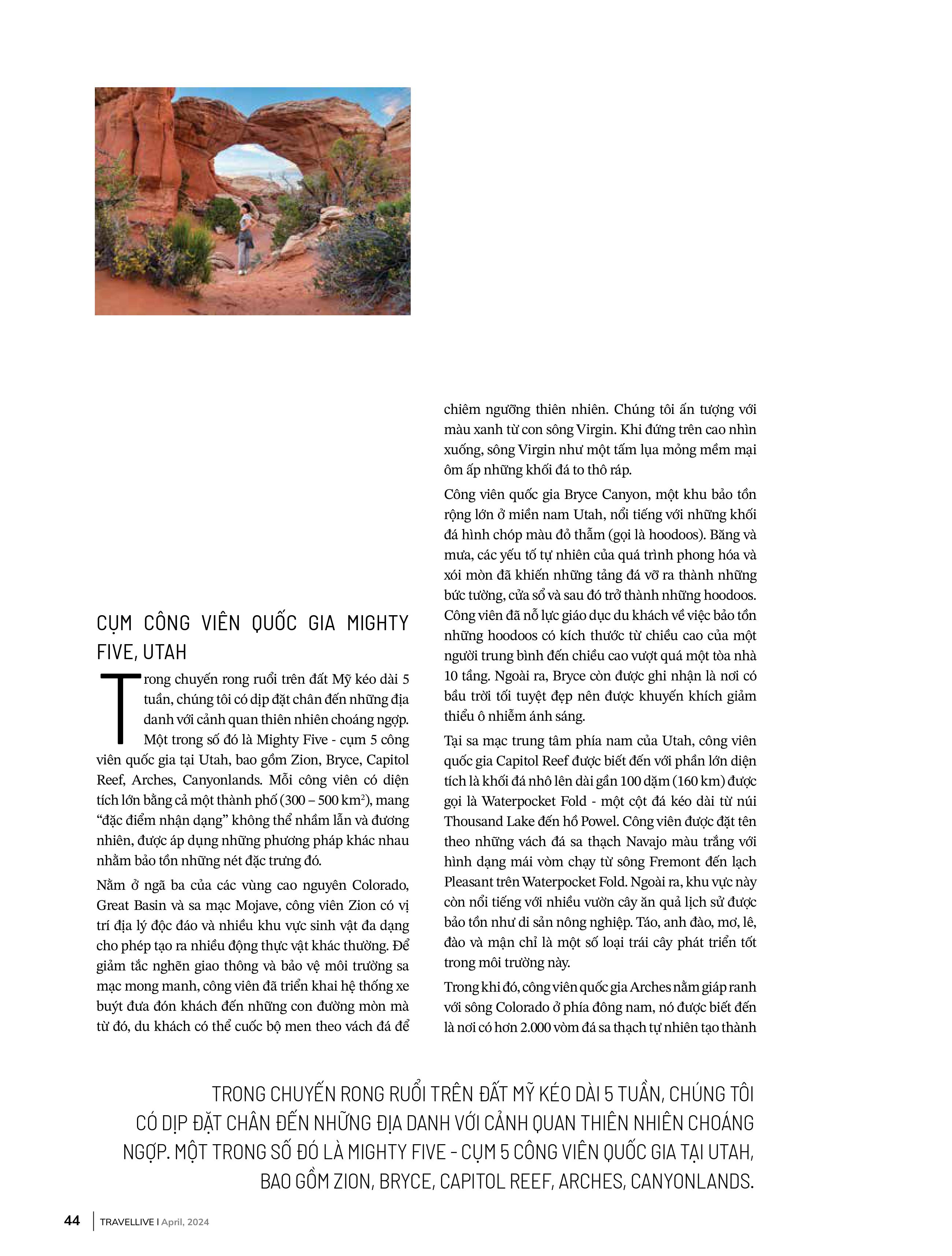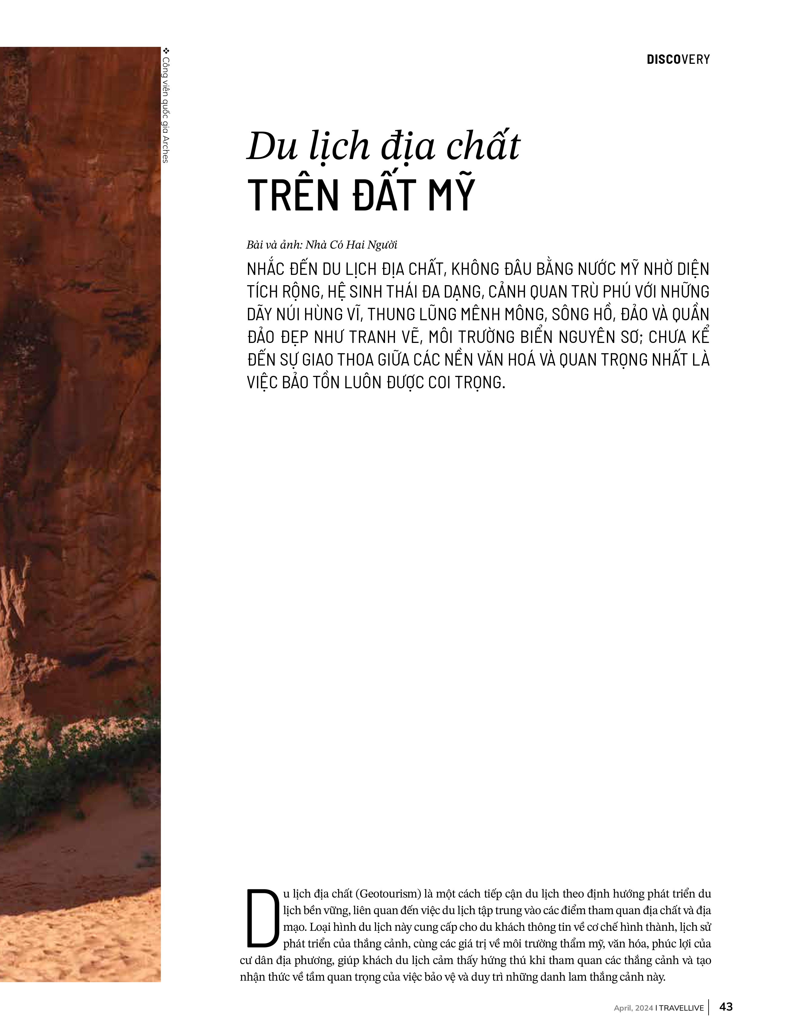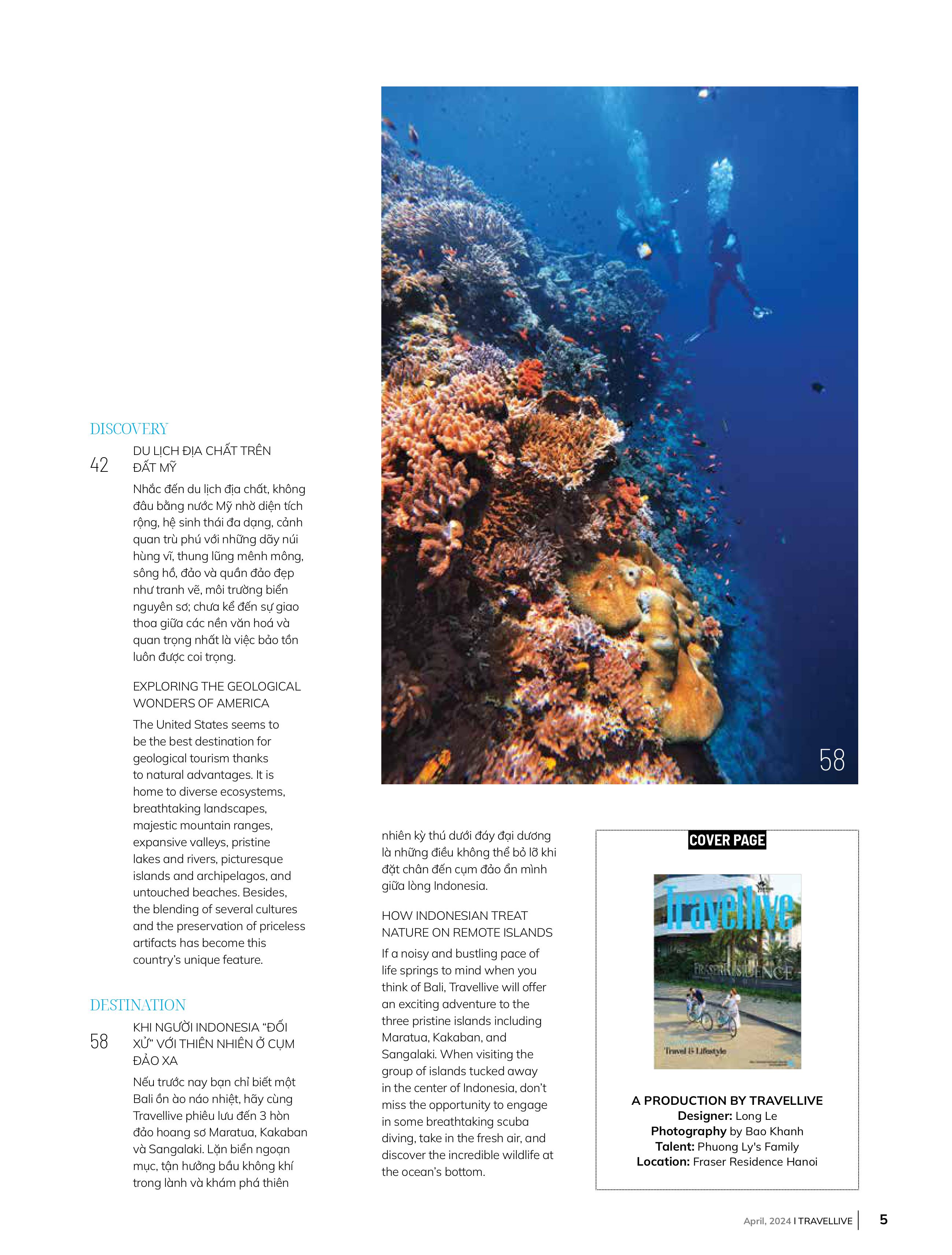Cũng trong ấn phẩm này, hãy cùng Travellive phiêu lưu khám phá địa chất trên đất Mỹ, xuôi dòng đến cụm đảo xa ở Indonesia ngắm nhìn thiên nhiên kỳ thú dưới đáy đại dương, đi bộ trên sông băng hùng vĩ ở Iceland, chạy motor ở Bắc Phi, hay nét ẩm thực độc đáo trong những con hàu vùng Bluff ở New Zealand… mỗi hành trình sẽ mang đến câu chuyện độc đáo và cảm xúc riêng biệt.