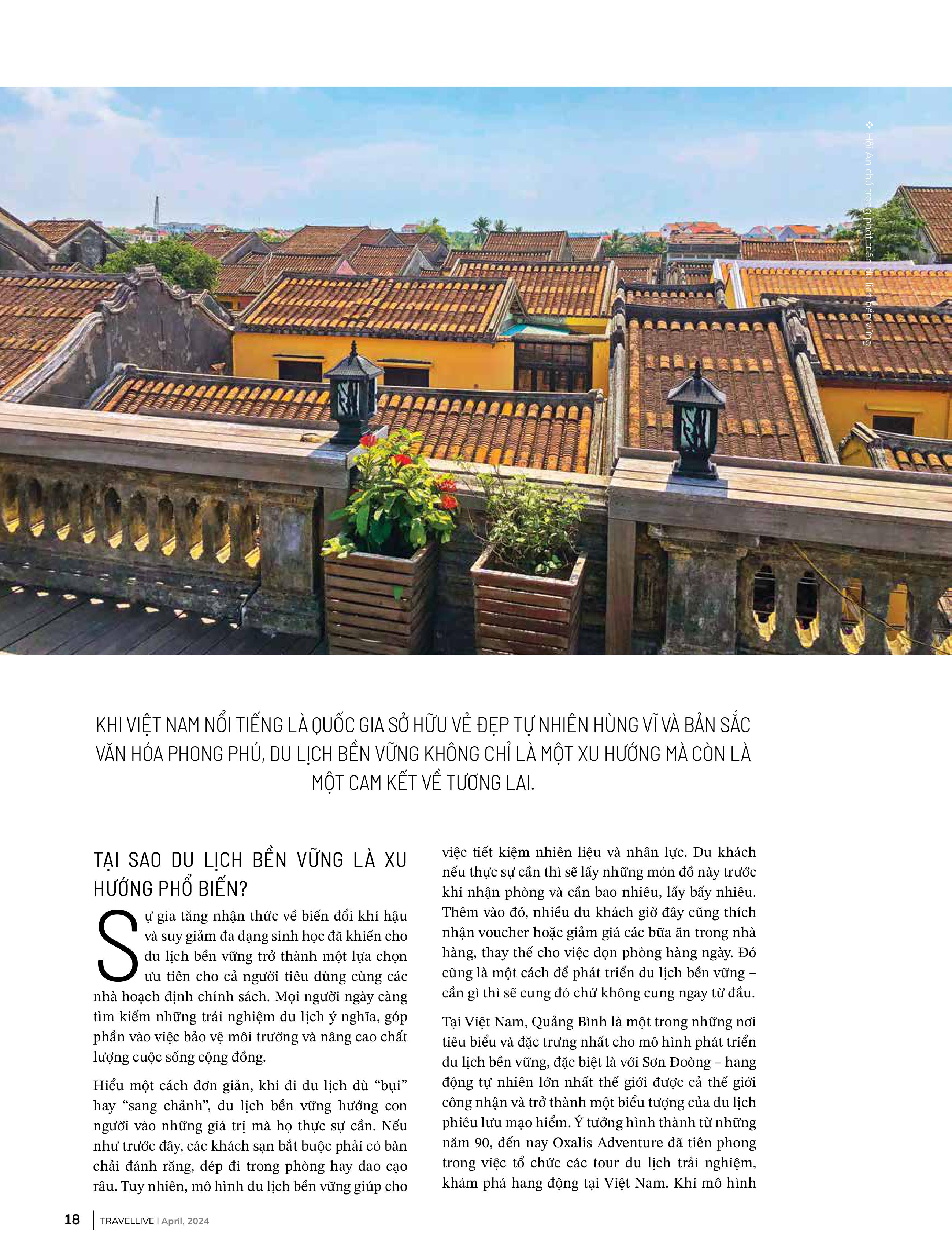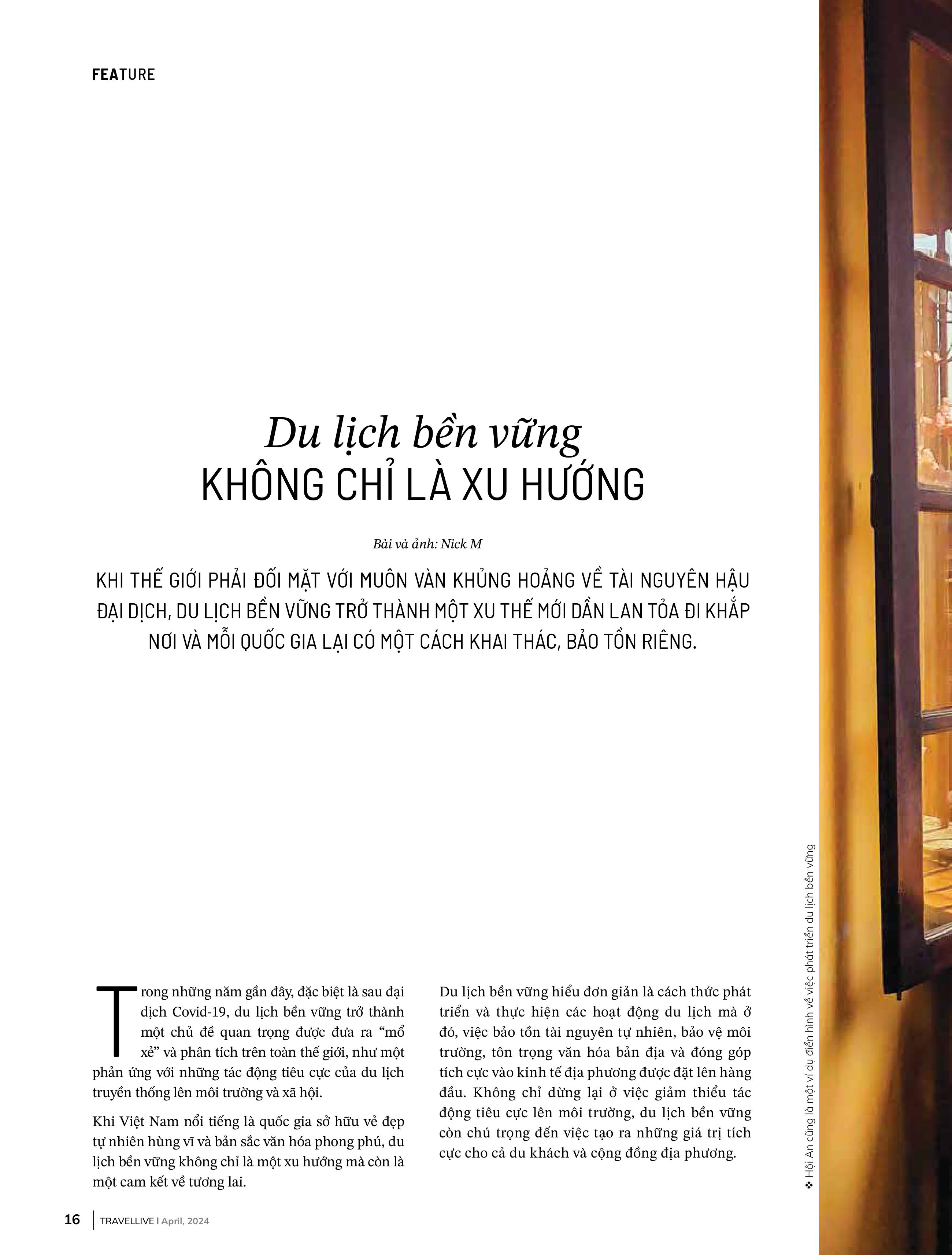 Khi thế giới phải đối mặt với muôn vàn khủng hoảng về tài nguyên hậu đại dịch, du lịch bền vững trở thành một xu thế mới và mỗi quốc gia lại có một cách khai thác riêng. Du lịch bền vững trở thành một chủ đề quan trọng được đưa ra “mổ xẻ” và phân tích trên toàn thế giới như một phản ứng với những tác động tiêu cực của du lịch truyền thống lên môi trường và xã hội. Trong số này, Travellive gửi tới độc giả những thông điệp và xu hướng du lịch bền vững qua nhiều bài viết của các tác giả Max Vũ, giảng viên ẩm thực học Alex Xuân-Bách Trần, nhà thơ Lê Ngọc, nhà báo Nick M…