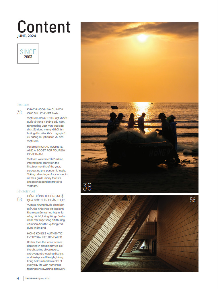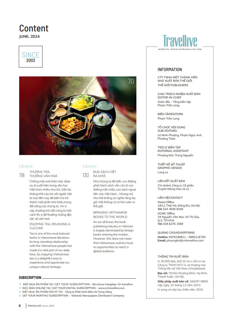 Xuôi theo dòng cảm xúc đó, độc giả có thể tìm thấy Việt Nam ghi dấu ấn trên bản đồ sao tại mục Ẩm thực, trà đạo cùng sách Việt ra khơi tại mục Lifestyle, 24 giờ xuyên lục địa đến bên bờ Đại Tây Dương tại mục Destination, khách quốc tế thích thú khi du lịch tại Việt Nam ở Feature hay sự giao thoa giữa Việt Nam và thế giới qua lăng kính của nghệ sĩ đương đại… tất cả hội tụ đủ trong 150 trang ấn phẩm lần này của Travellive.