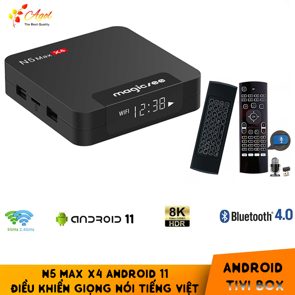 AGOL SHOP XIN GIỚI THIỆU SẢN PHẨM Android tivi box MAGICSEE N5 MAX X4 Ram 4G Android 11 điều khiển giọng nói kiêm bàn phím chuột bay có đèn nền dual wifi 2 băng tần bluetooth S905X4 cài sẵn phim, truyền hình cáp miễn phí vĩnh viễn cáp miễn phí vĩnh viễn