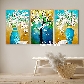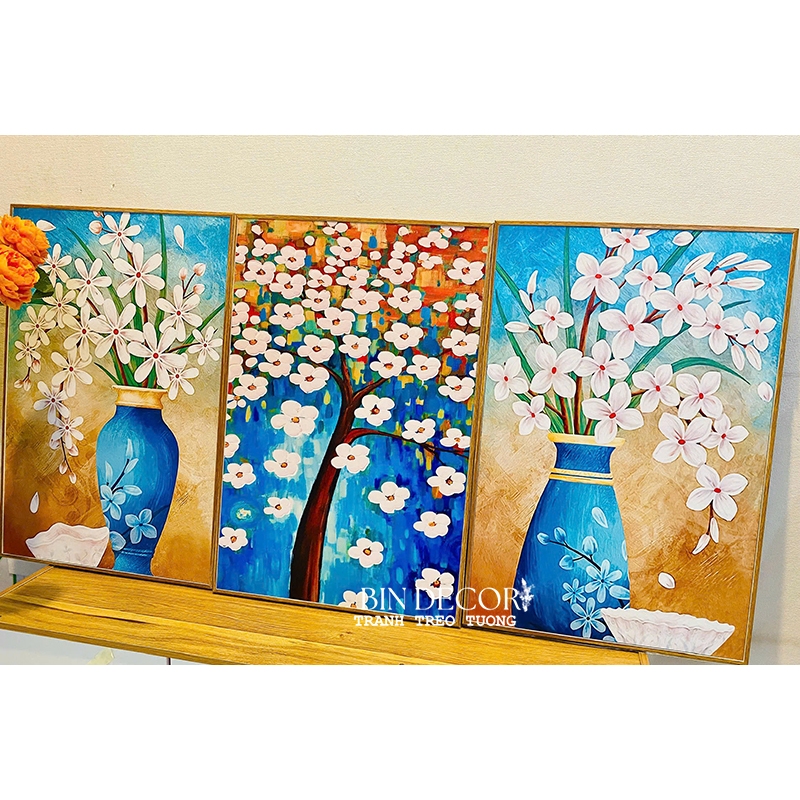 Tranh in trên vải canvas hội họa Kích thước: 40x60cm x3 Tấm lưng bằng gỗ MDF nhập khẩu. Khung vật liệu composite. Không bị ảnh hưởng bởi nước, ẩm mốc. Tặng kèm đinh 3 chân