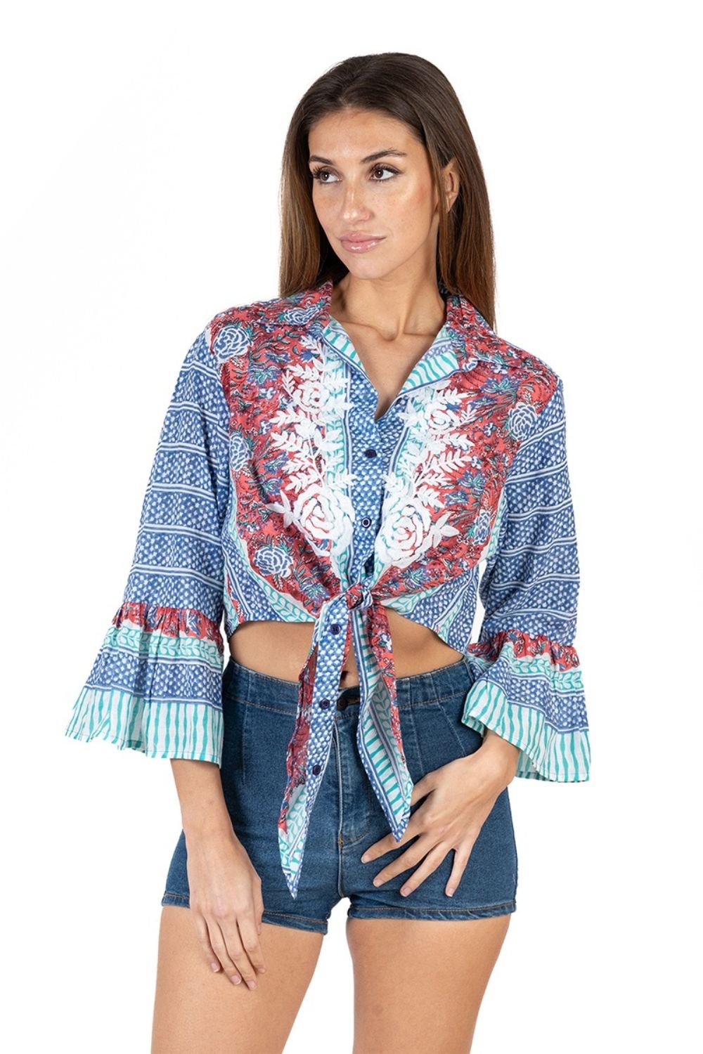 Áo Boho Hoa Nổi Cotton Isla Bonita, chất liệu cotton mềm mại, nổi bật phần họa tiết hoa nổi trước ngực. Tay loe nhẹ. Kiểu Crop top mặc phối với chân váy, quần jeans, quần