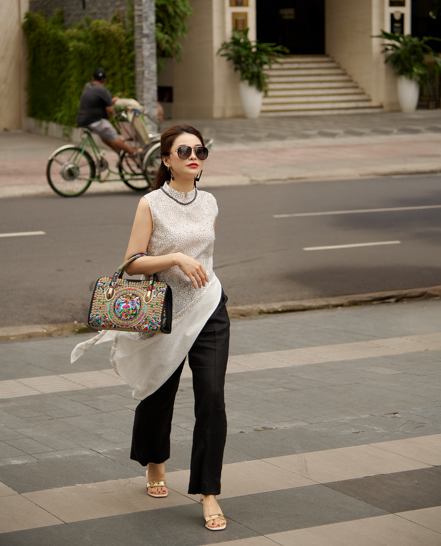 Áo dài kiểu dáng suông cách tân không tay Cổ cao 3.5cm Chích ben ngực và ben sau lưng Cài bằng dây khoá kéo sau lưng 2 lớp: lớp ngoài organza, lớp trong cotton lụa 80gsm CHẤT LIỆU Chất liệu chính: Organza (Polyester) Chất liệu lót: Cotton 100% Nghệ nhân: Thanh Thuỷ, Bích Hoà Cắt may thủ công tinh tế tại Hity Atelier, Nha Trang, Việt Nam HƯỚNG DẪN SỬ DỤNG Để trang phục của bạn luôn sạch sẽ, mới đẹp và cùng góp phần bảo vệ môi trường giảm thải quần áo cũ, Ms. Hity khuyến khích bạn chăm sóc đúng cách quần áo của mình: Giặt máy ở nhiệt độ tối đa 30ºC, bọc trong túi giặt, vắt ở tốc độ thấp Không sử dụng nước tẩy / thuốc tẩy Phơi khô trên bề mặt phẳng Không sử dụng máy sấy Ủi ở nhiệt độ tối đa 110ºC (Chế độ Lụa Silk) Ủi bằng bàn ủi hơi nước