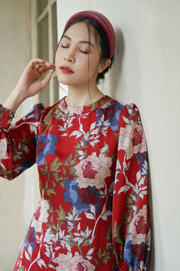 áo dài suông đỏ đô kết chim và hoa , tay lỡ loe