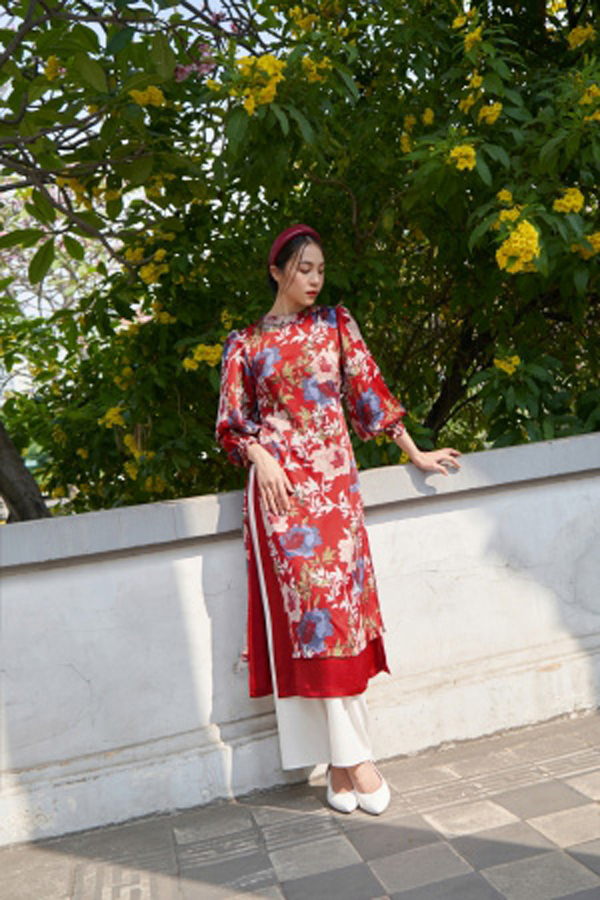 áo dài đỏ form suong may chất liệu lụa gấm kết hoa sen, tay lỡ loe, quần lụa trắng