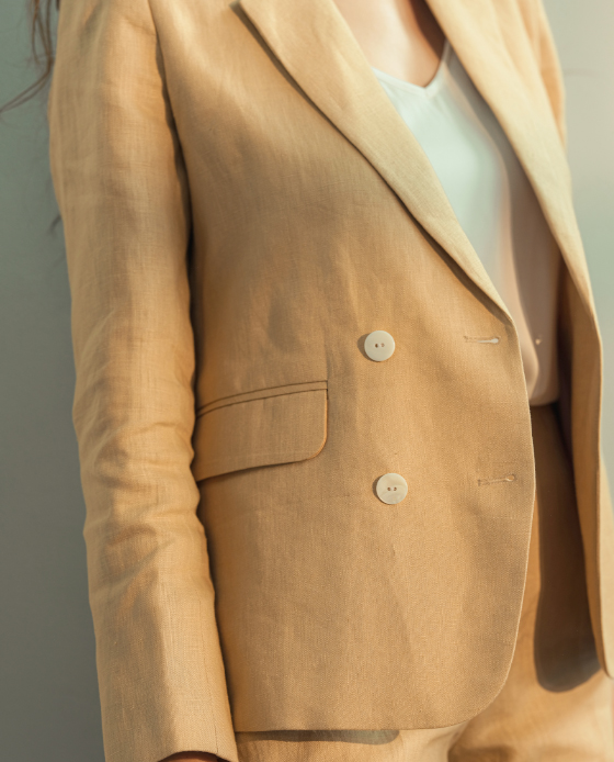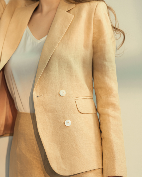 Một chiếc áo khoác blazer màu be nhạt được làm từ chất liệu linen cao cấp;
