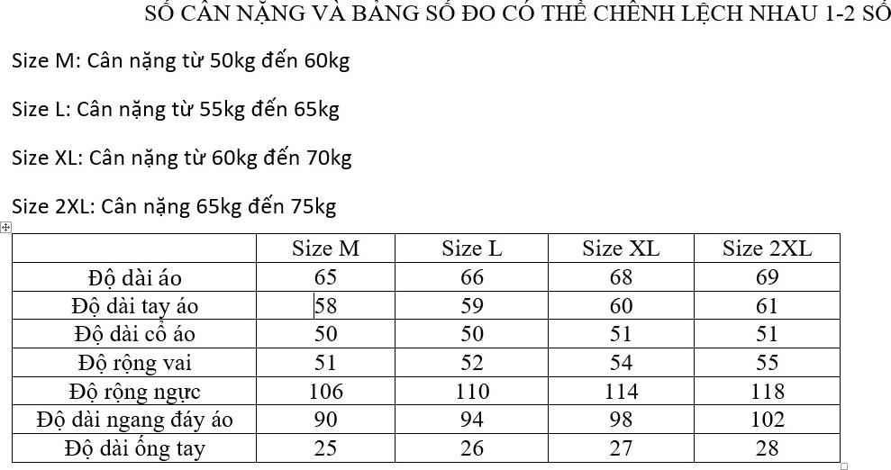 - Các bạn tham khảo số cân nặng và bảng số đo để lựa chọn size phù hợp với bản thân (số cân nặng và số đo có thể chênh lẹch 1-2 số) Size M: Cân nặng từ 50kg đến 60kg Size L: Cân nặng từ 55kg đến 65kg Size XL: Cân nặng từ 60kg đến 70kg Size 2XL: Cân nặng từ 65kg đến 75kg Size M Size L Size XL Size 2XL Độ dài áo 65 66 68 69 Độ dài tay áo 58 59 60 61 Độ dài cổ áo 50 50 51 51 Độ rộng vai 51 52 54 55 Độ rộng ngực 106 110 114 118 Độ dài ngang đáy áo 90 94 98 102 Độ dài ống tay 25 26 27 28