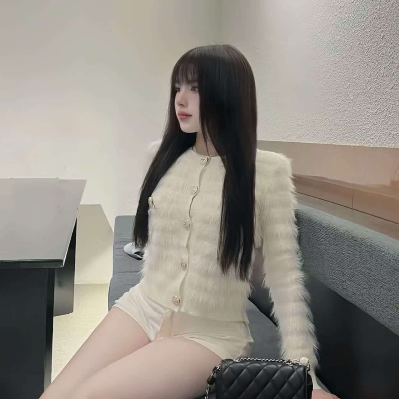 Chất len lông thỏ mềm mịn, sờ cực êm tay, lên form sang xịn • Thiết kế tay dài, hàng nút vàng nổi bật tạo điểm nhấn thanh lịch • Dễ phối cùng váy, quần
