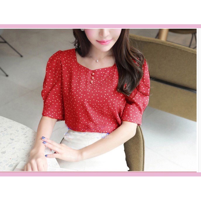 Áo kiểu nữ tay lỡ cổ vuông tim sang chảnh, chiểu dài qua rốn thích hợp mặc công sở, dạo phố - Với thiết kế áo kiểu cổ vuông V nhẹ nhàng tinh tế, thích hợp mặc đi làm, dự tiệc hoặc cafe cùng bạn bè. Kiểu dáng basic kết hợp trên nền họa tiết chấm bi đẹp, tạo điểm nhấn cho người mặc, mang đến nét đẹp sang trọng và quyến rũ