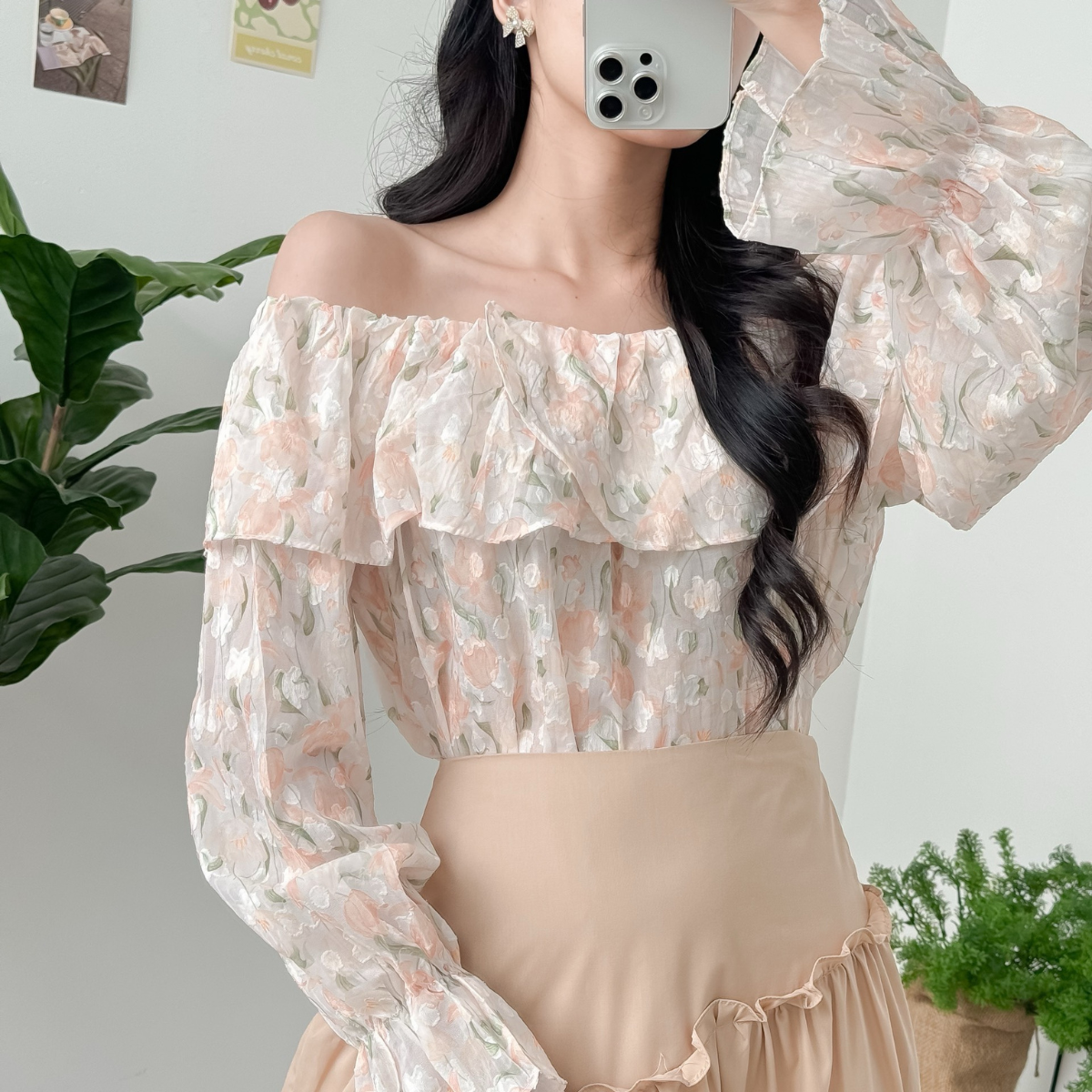 ✨Áo kiểu trễ vai họa tiết hoa nữ tính thích hợp du lịch Hafsah Miều Est.2013