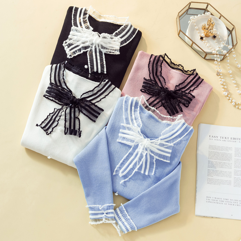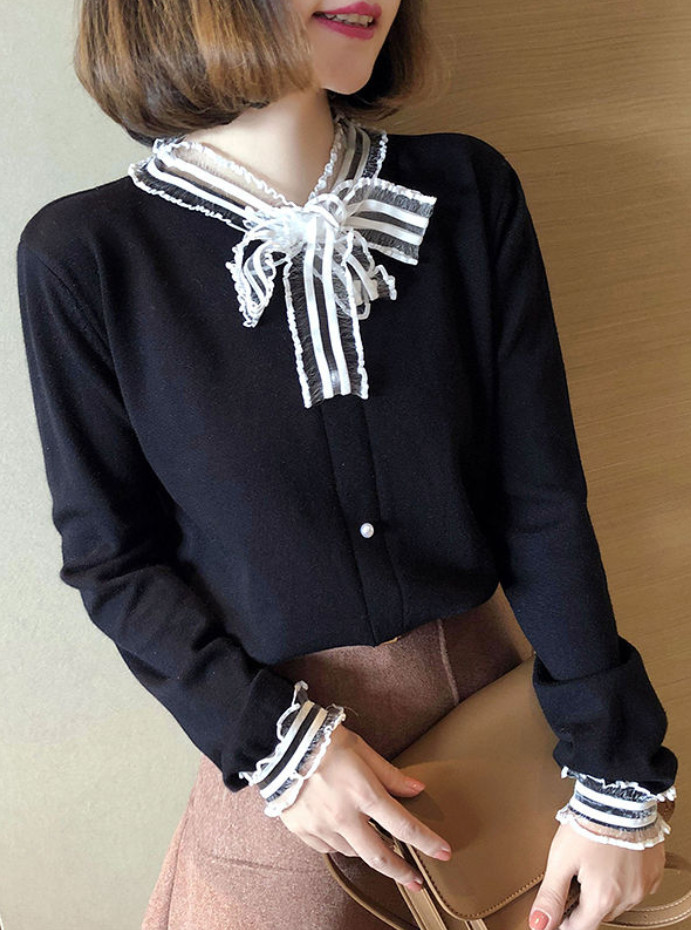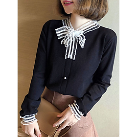 Áo len cổ bèo cúc đính nơ sọc
