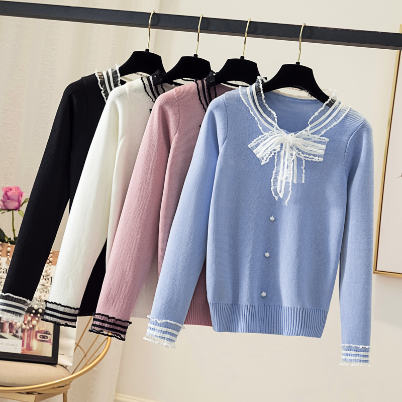 Áo len cổ tròn dài tay đính nơ cho nữ