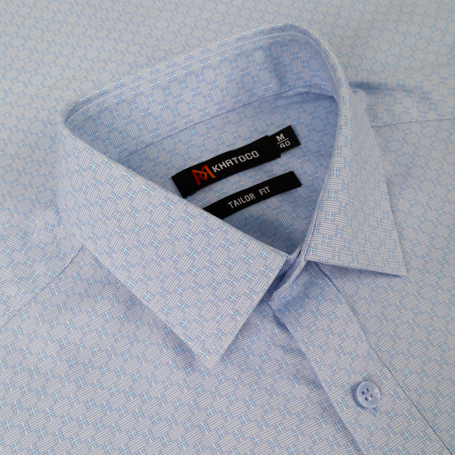 (V) MÔ TẢ: Form Taylor, tai dài Form áo tiêu chuẩn với form áo rộng vừa phải, không ôm sát cơ thể, bó nhẹ ở vùng eo và tay áo. Độ rộng vùng ngực và nách cũng sẽ fit hơn với cơ thể. Không quá rộng như form áo cổ điển. Màu vải nhã nhặn và trung tính dễ dàng phối trang phục tạo sự lịch lãm, nam tính Nút ton-sur-ton khắc logo đẹp mắt phối trọn vẹn màu áo. Logo thêu sắc nét trên túi áo. Chất liệu:50%POLYESTER- 24%COTTON-2%SPANDEX- 24%VISCOSE(BAMBOO) |Mềm mịn|Thấm hút |Kháng khuẩn|Độ thoáng khí cao|Chống tia UV|Chống nhăn|Chống co rút |Nhanh khô|Dễ vệ sinh làm sạch|Đứng phom áo Màu sắc : Màu Xanh họa tiết