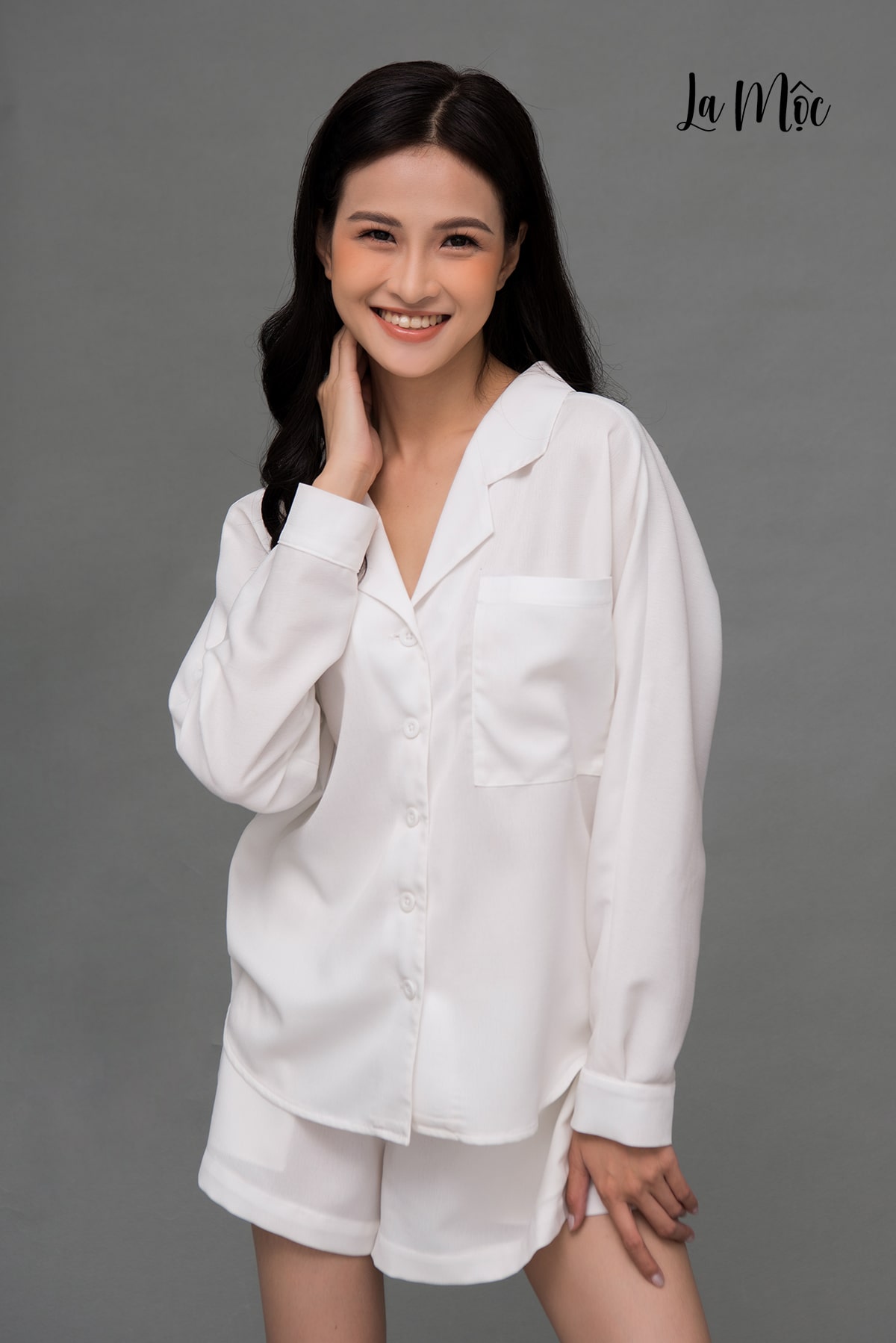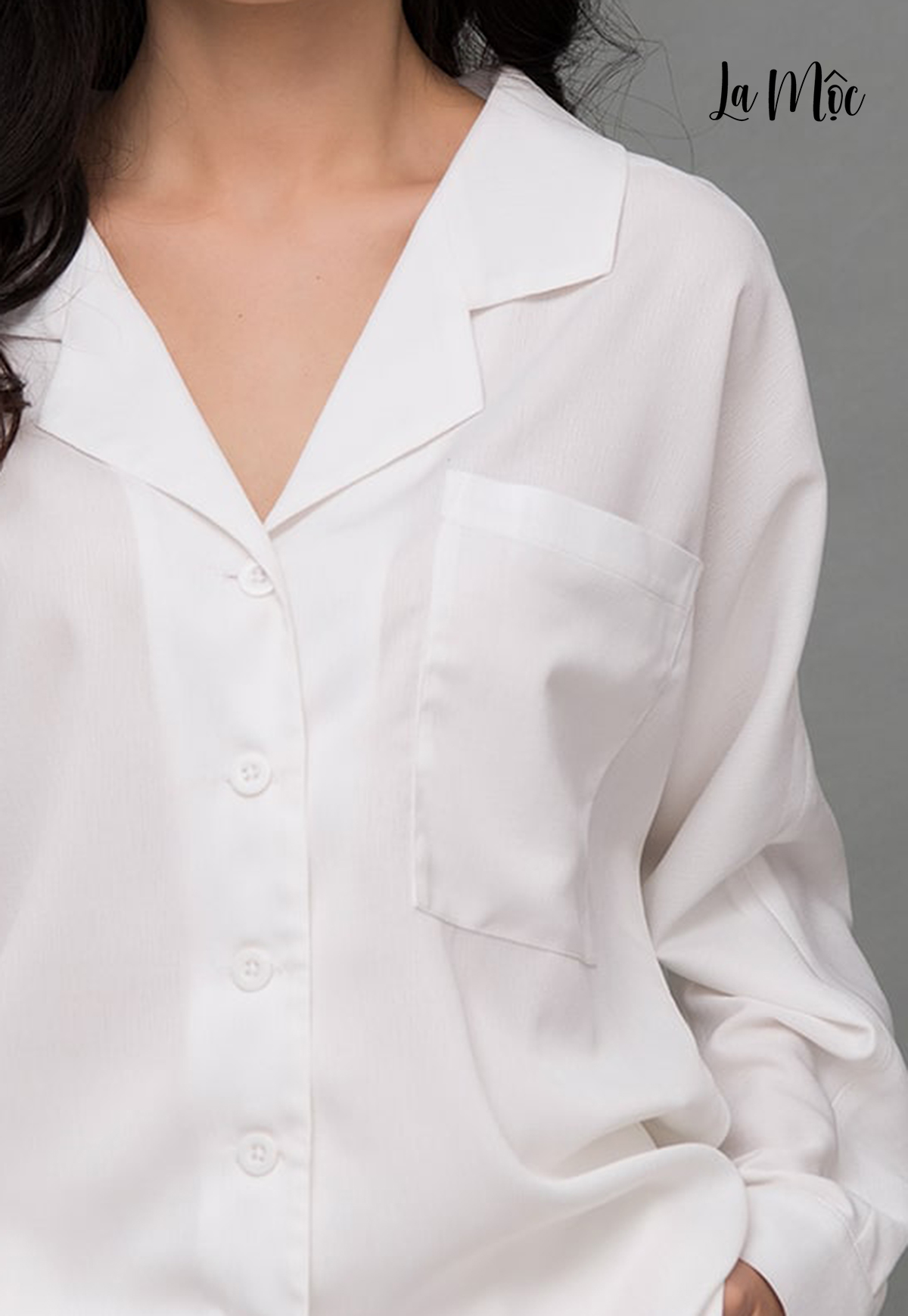 Áo sơ mi nữ LA MỘC, áo cổ bẻ chất lụa xô Hàn Quốc, kiểu vest Phom vest cổ đan tông, tay dài sơ mi, nắp túi, vạt áo bầu. Màu trắng dễ dàng phối